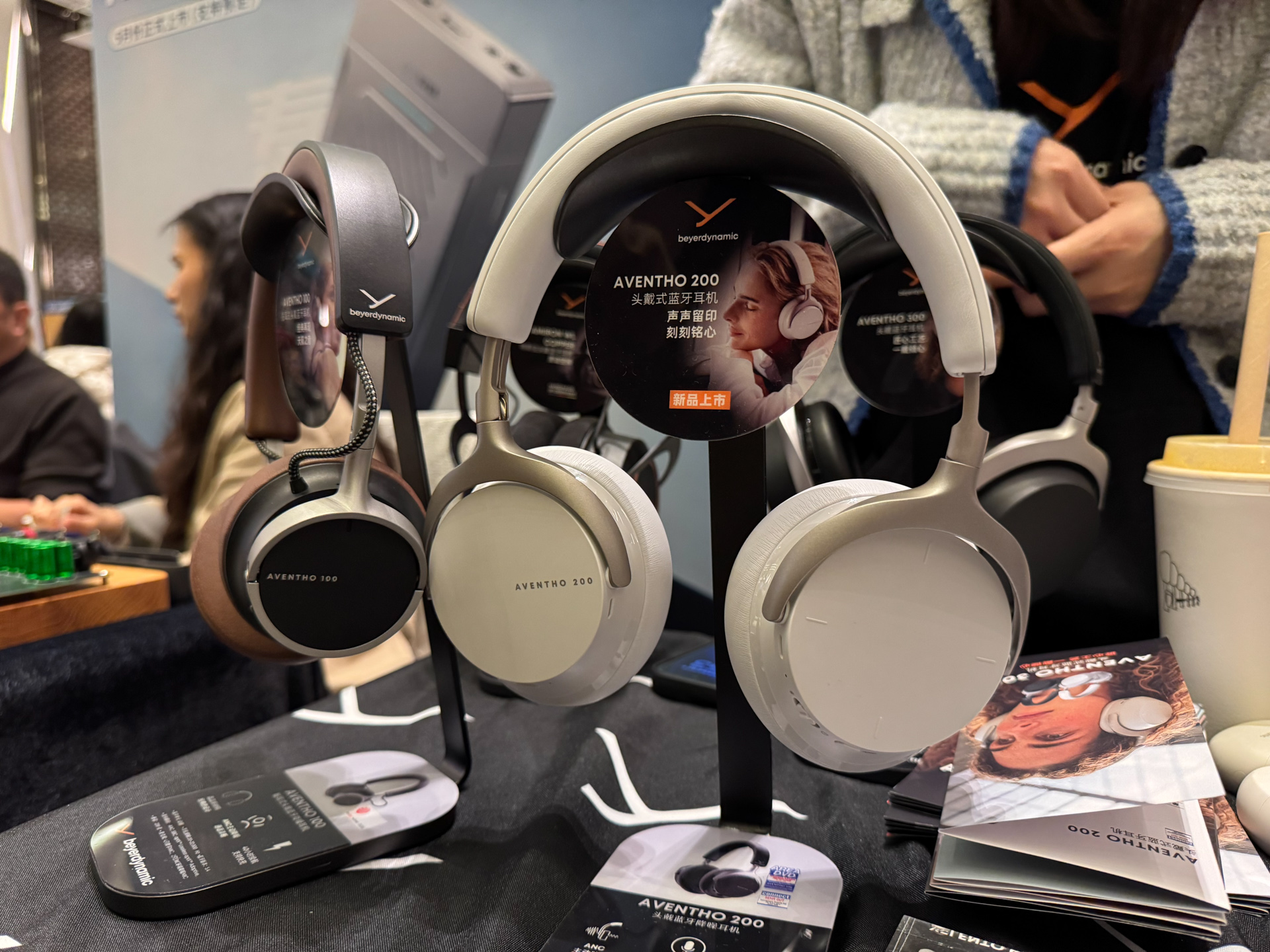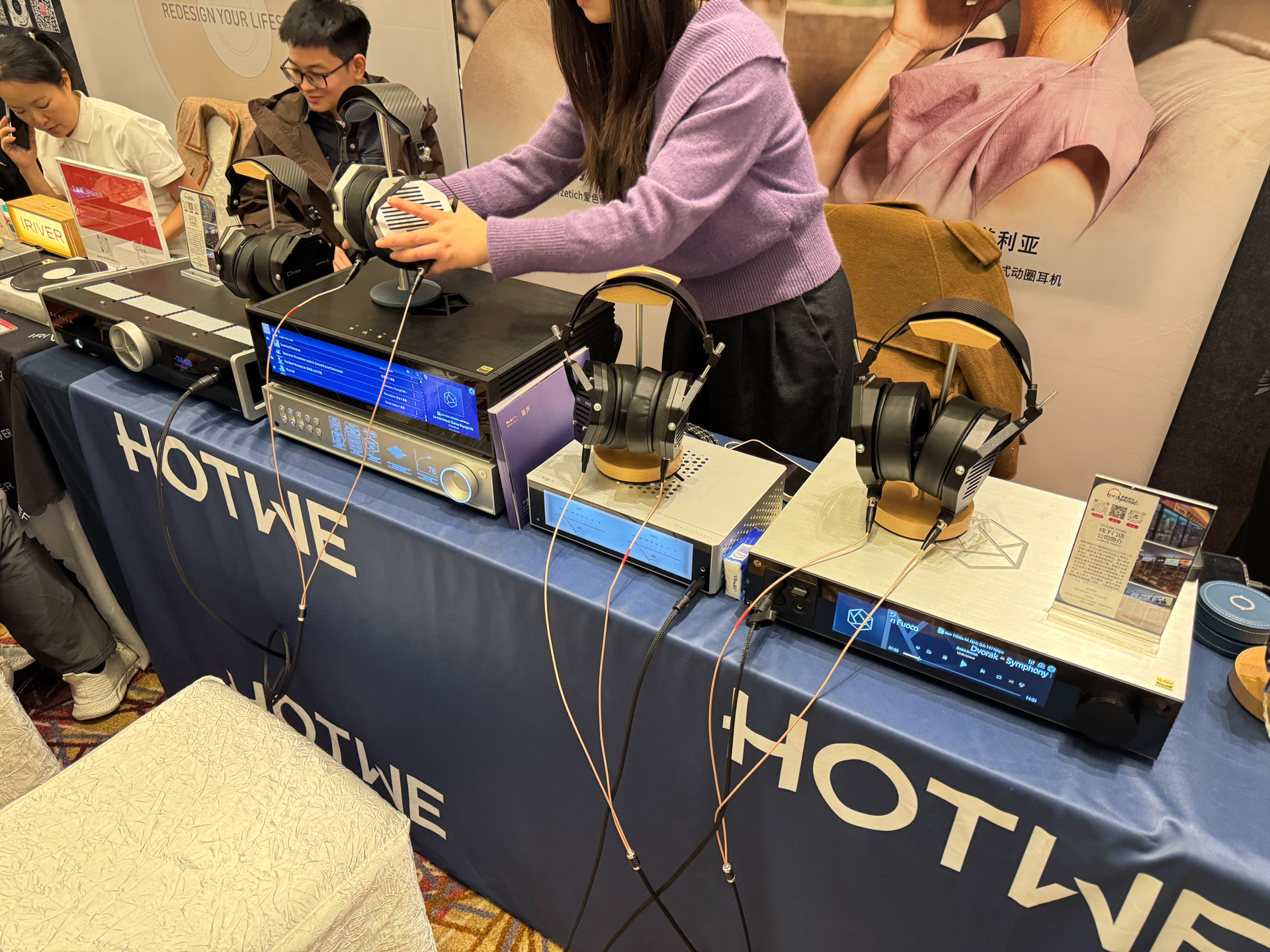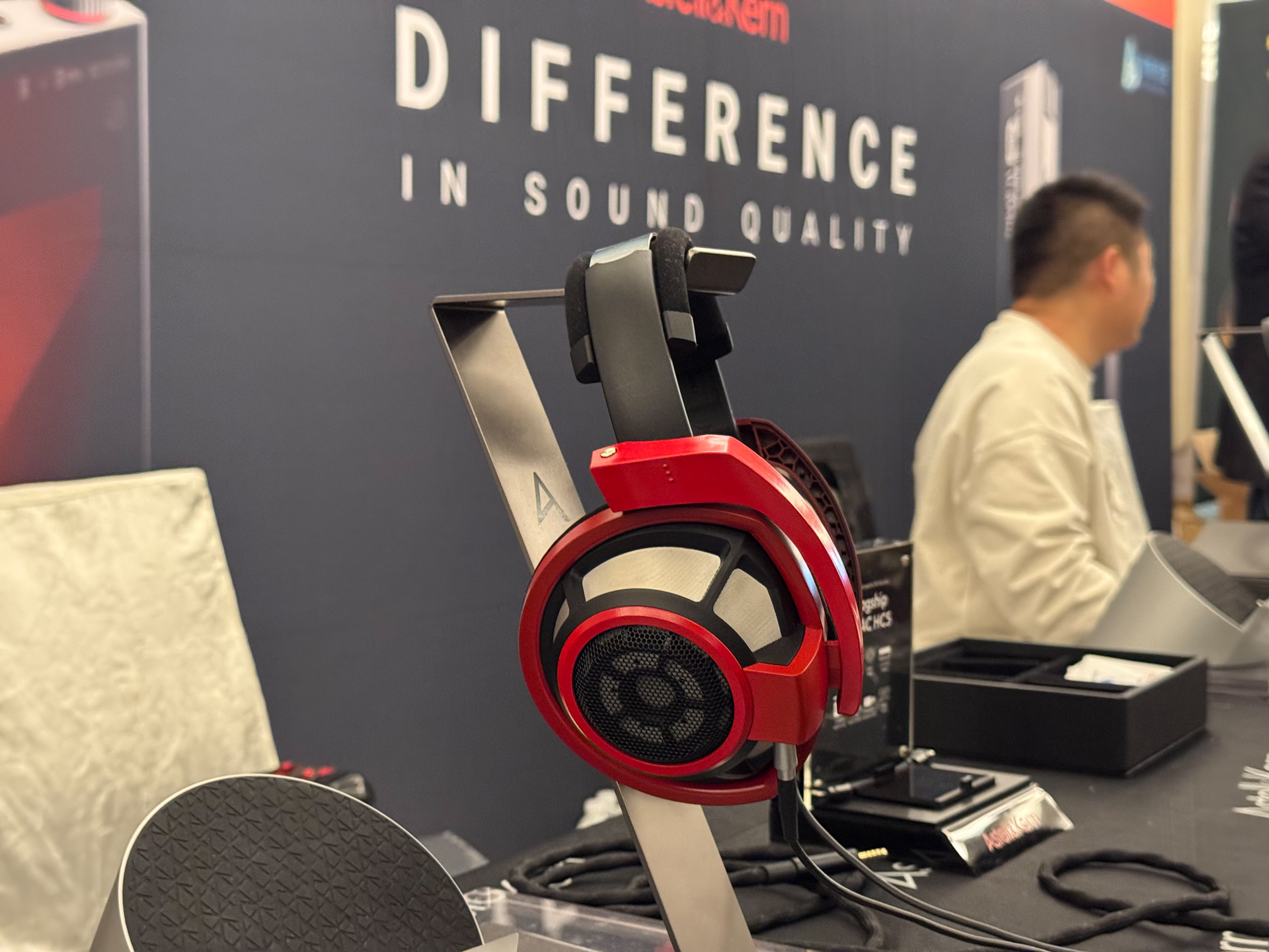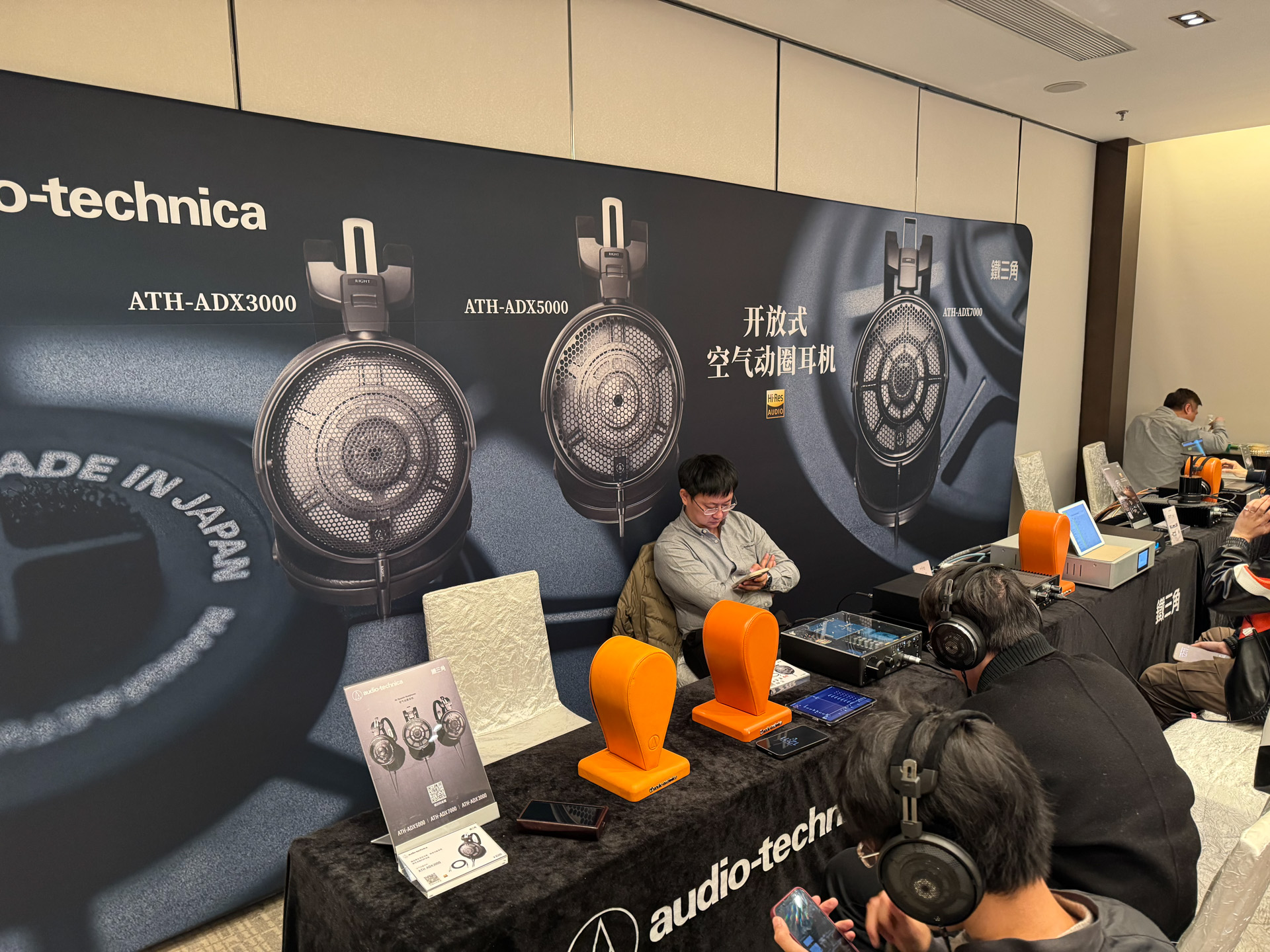 达音科展位上,同业好友表示非常喜欢右边那个大耳机,没记错的话是叫岚。