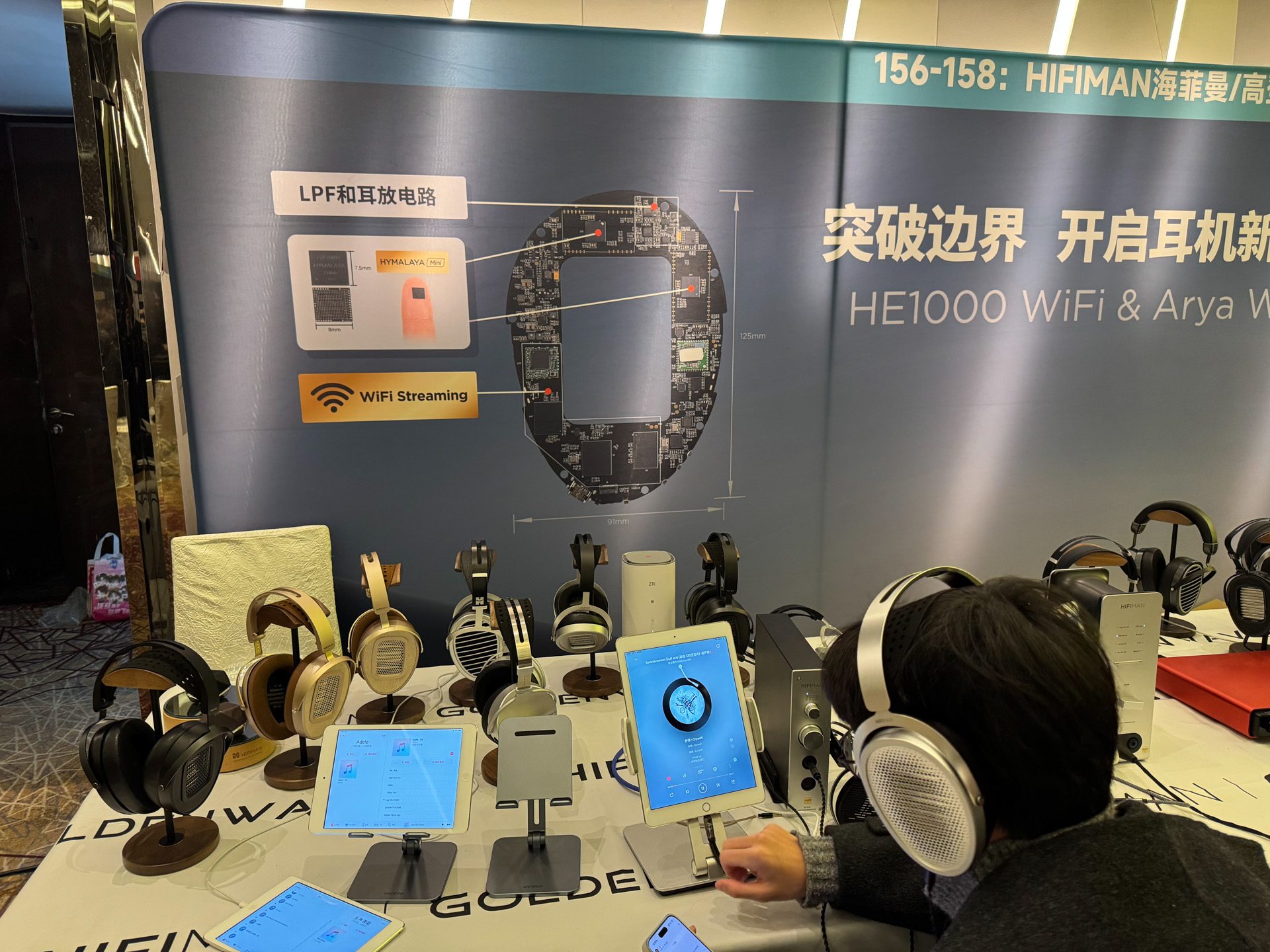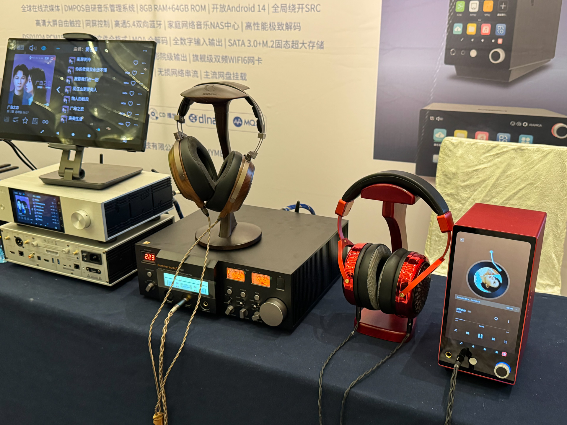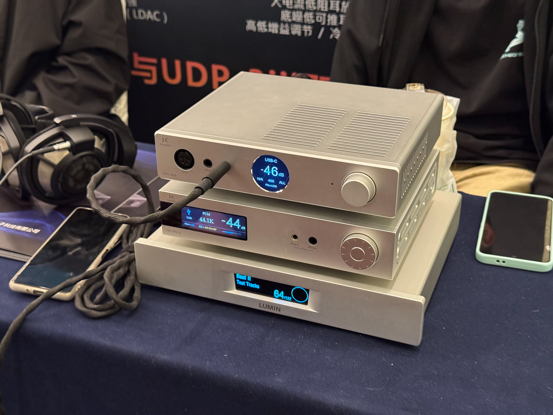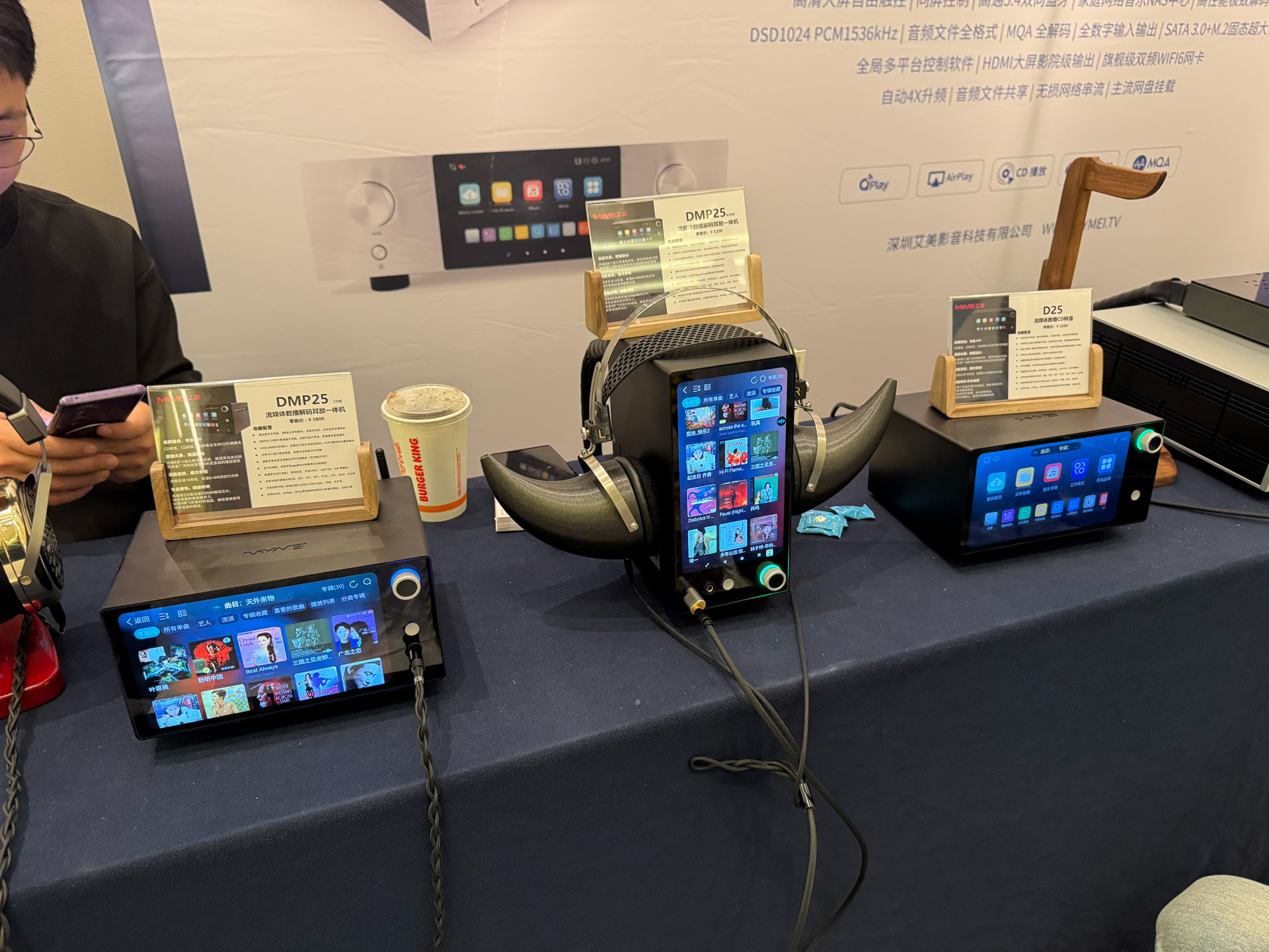 达音科展位上,同业好友表示非常喜欢右边那个大耳机,没记错的话是叫岚。
