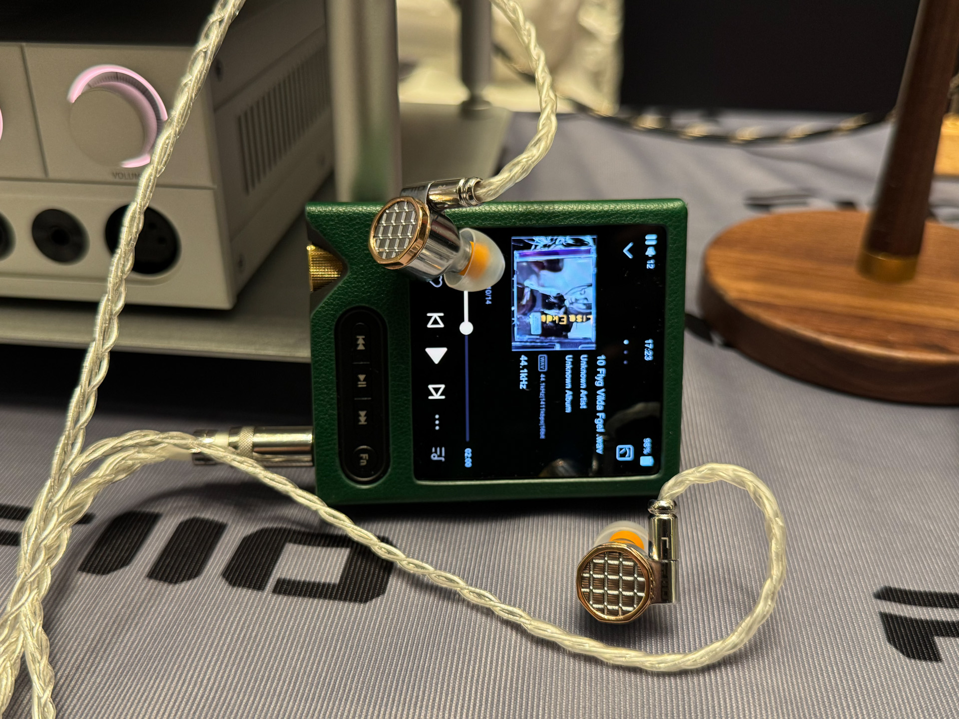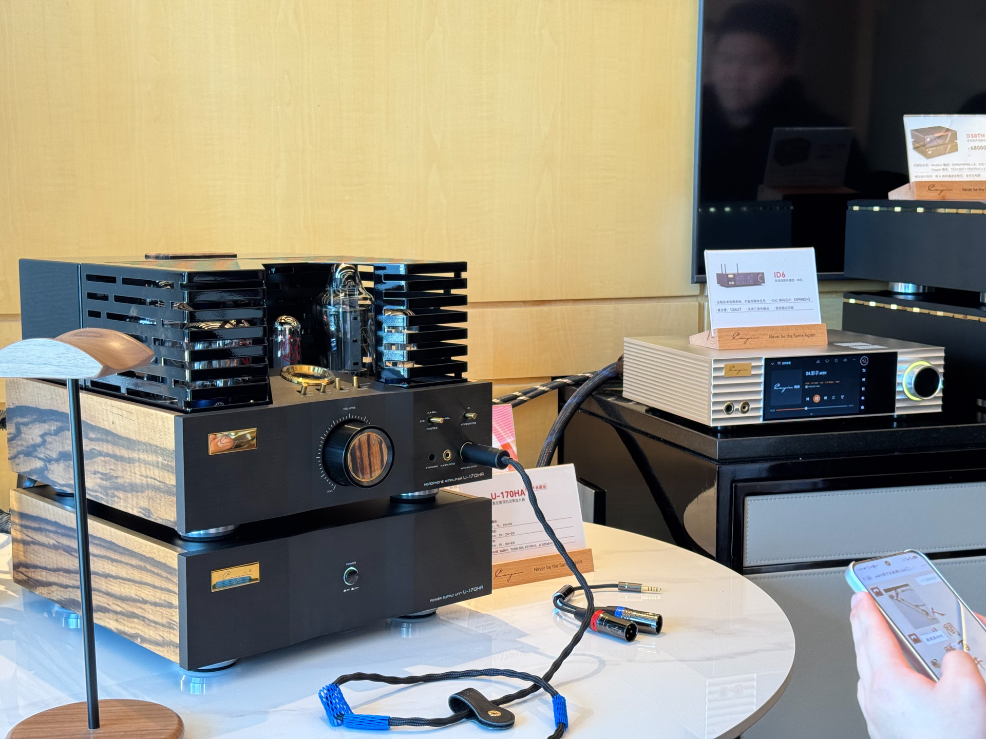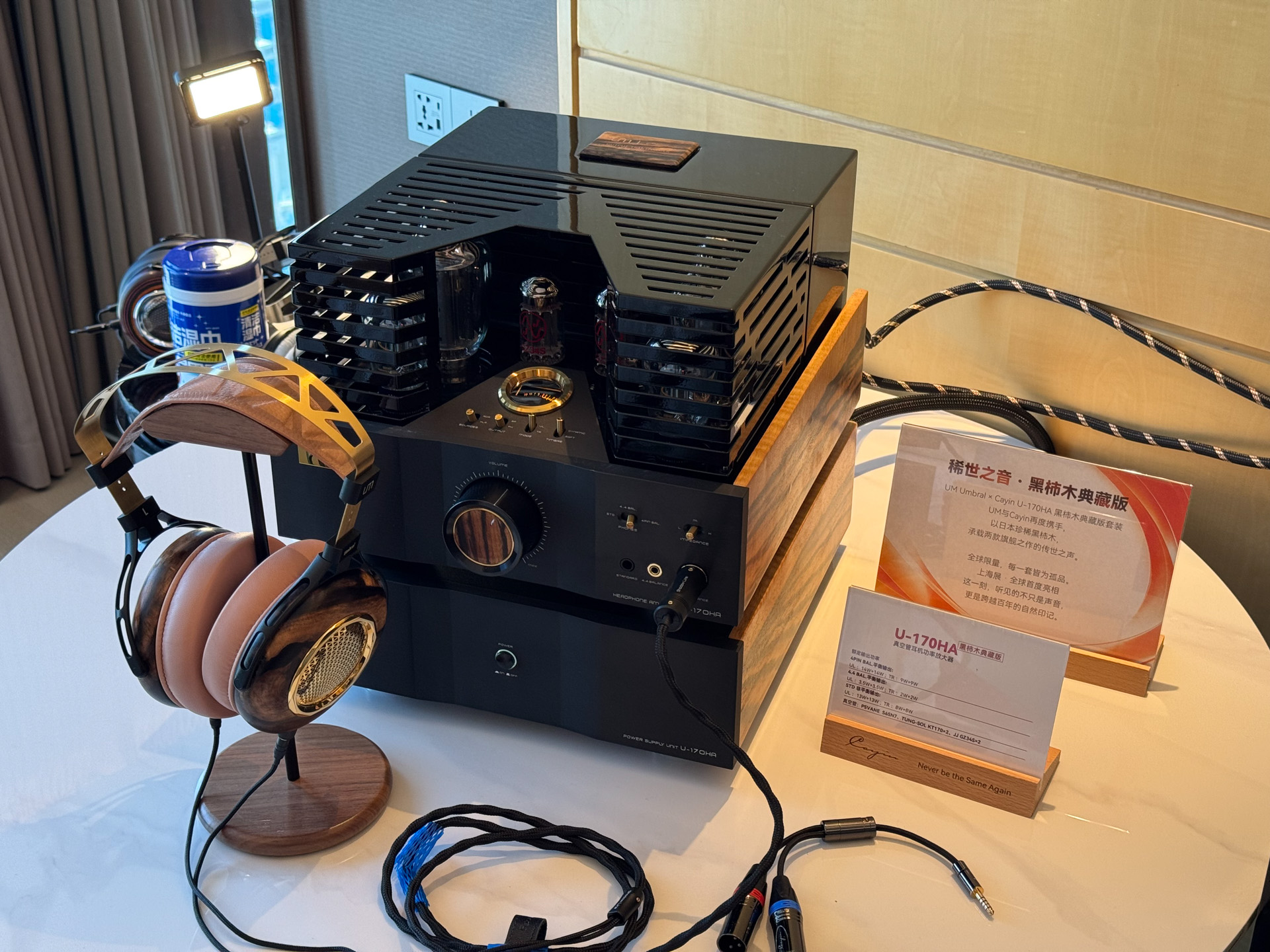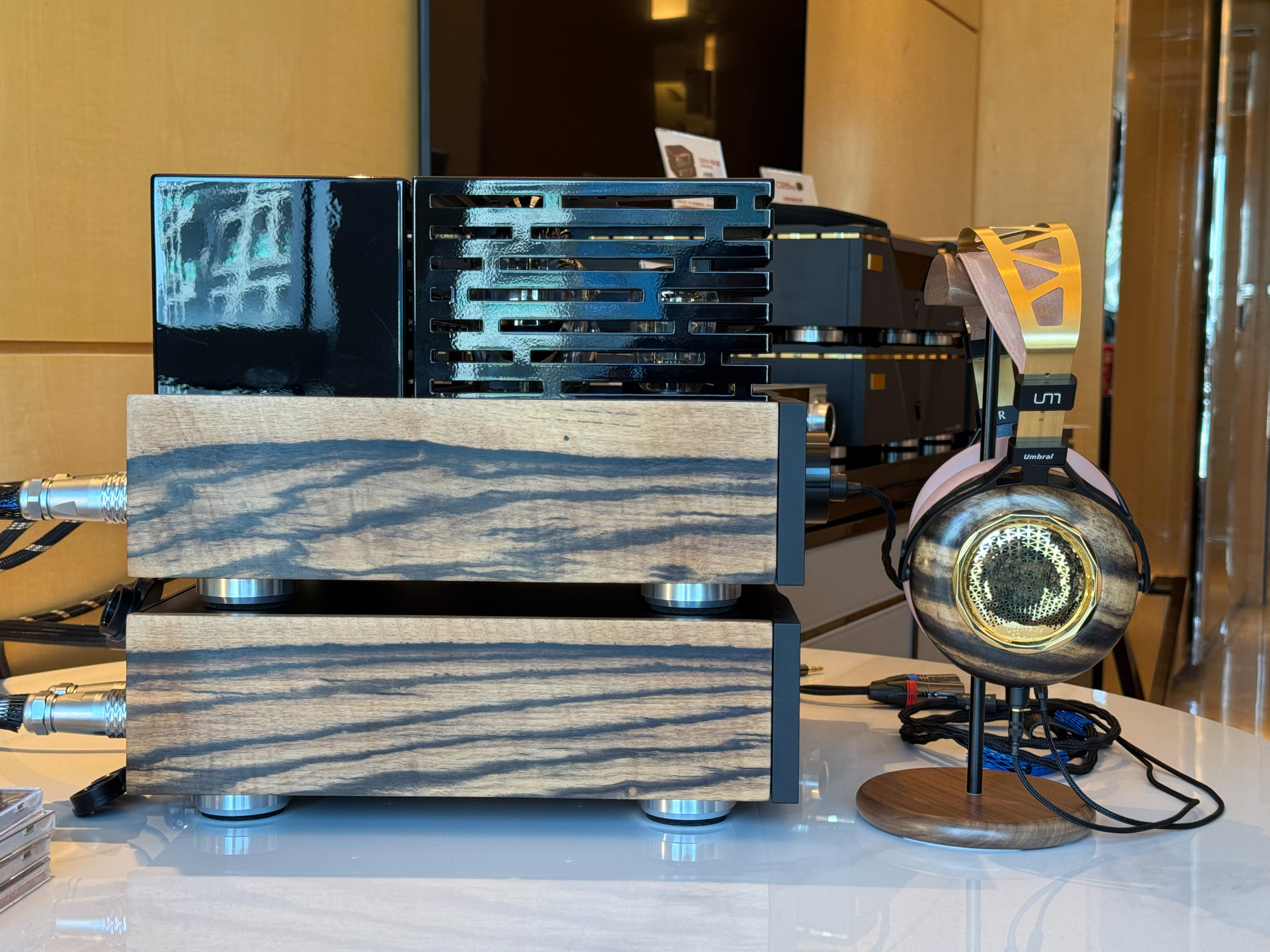 刚到展会没多久,同业好友拉我去一起听听高端新品,来自珠海的双子星品牌,凯音耳放+UM的耳机的联名限量组合,耳放面板与耳机腔体,同样用了名贵的黑柿木材质。非常漂亮,肉眼可见十分高大上的一套。
