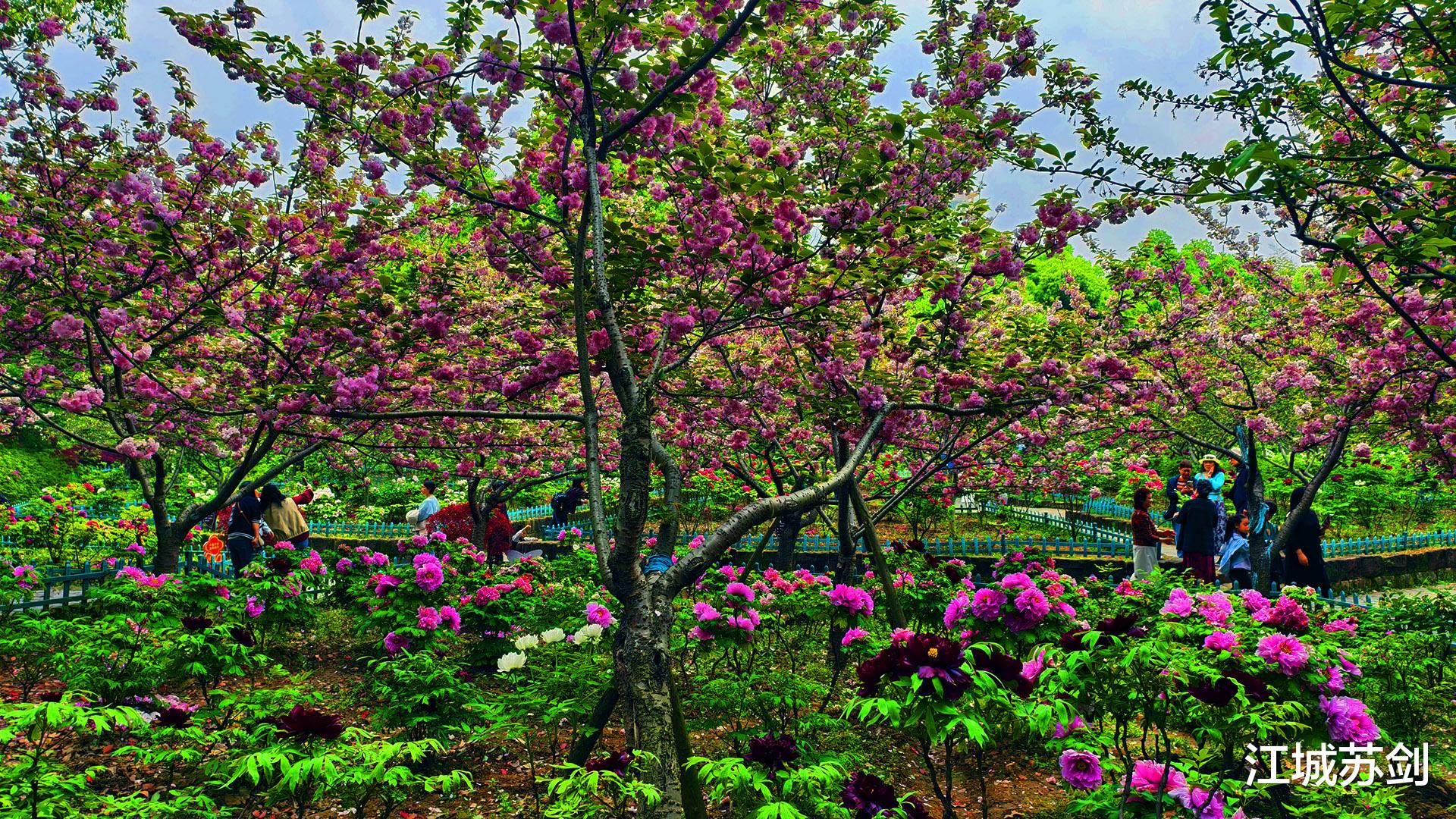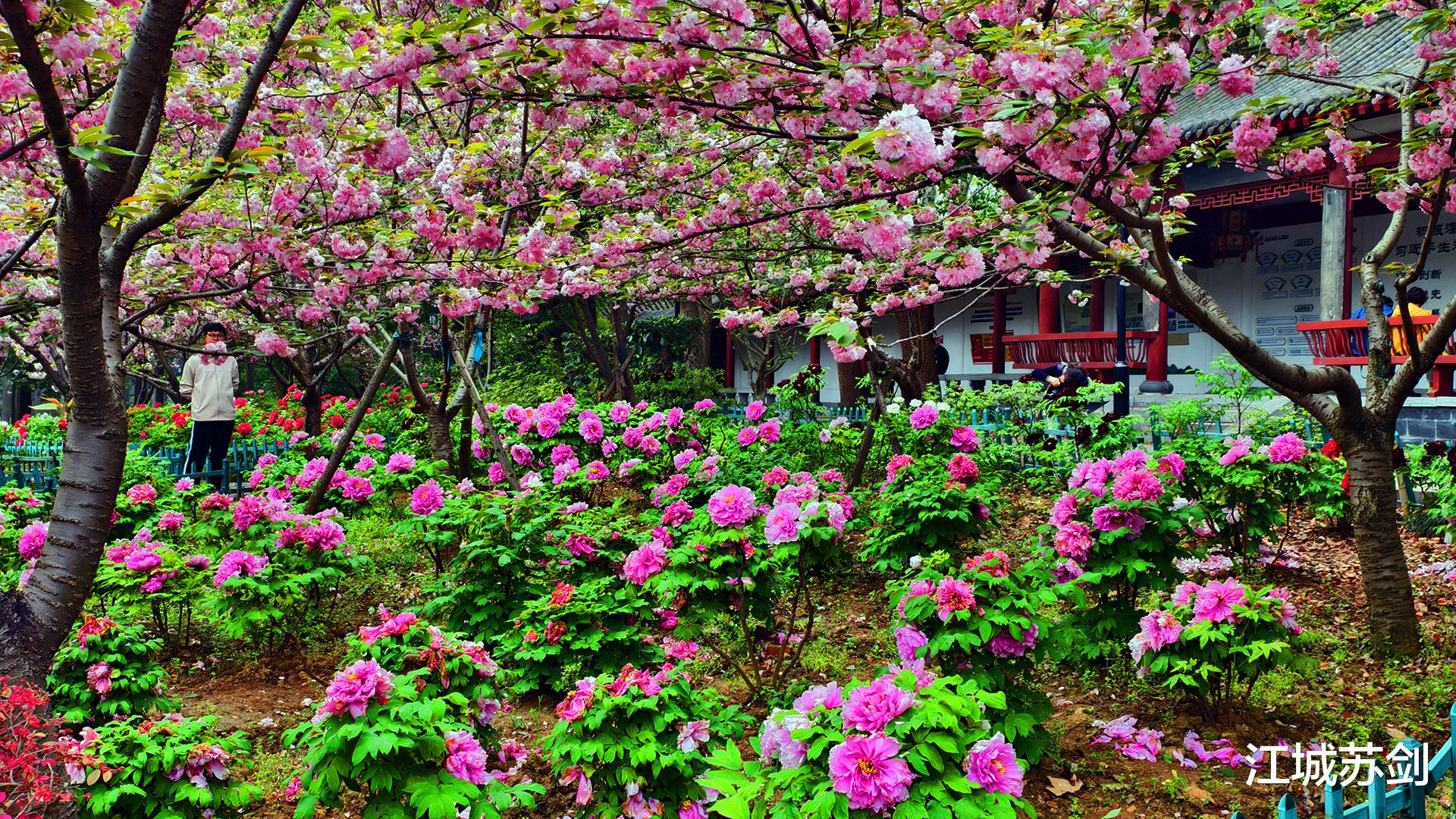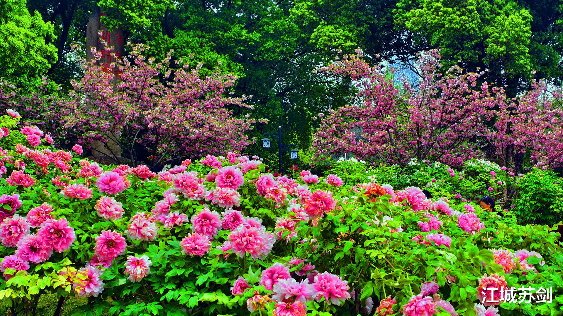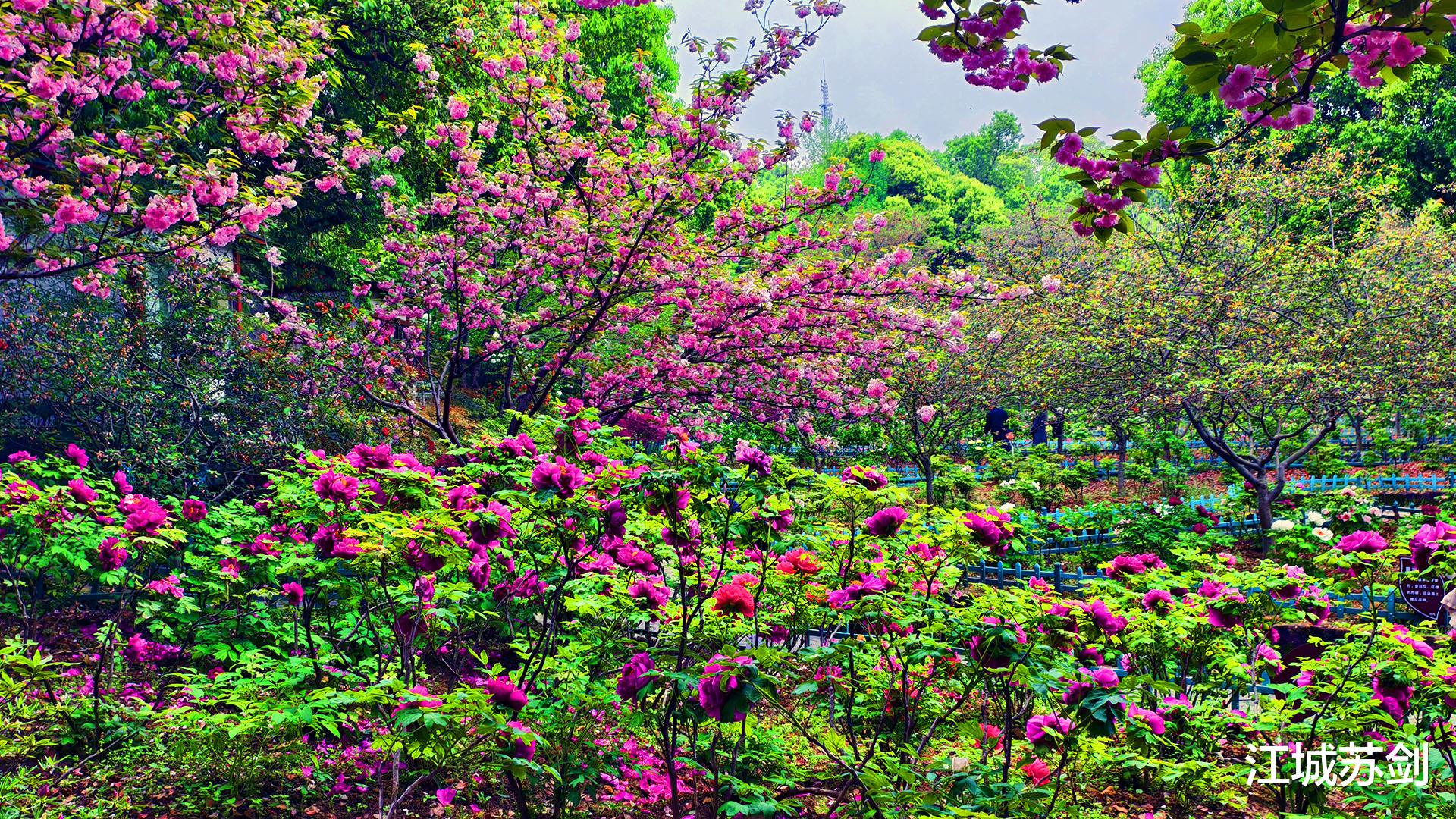 暮春时节,漫步武汉东湖牡丹园中,忽见一景令人心醉——红艳艳的樱花与牡丹,竟在此刻同框争艳。抬头望去,樱花如霞似火,红艳艳