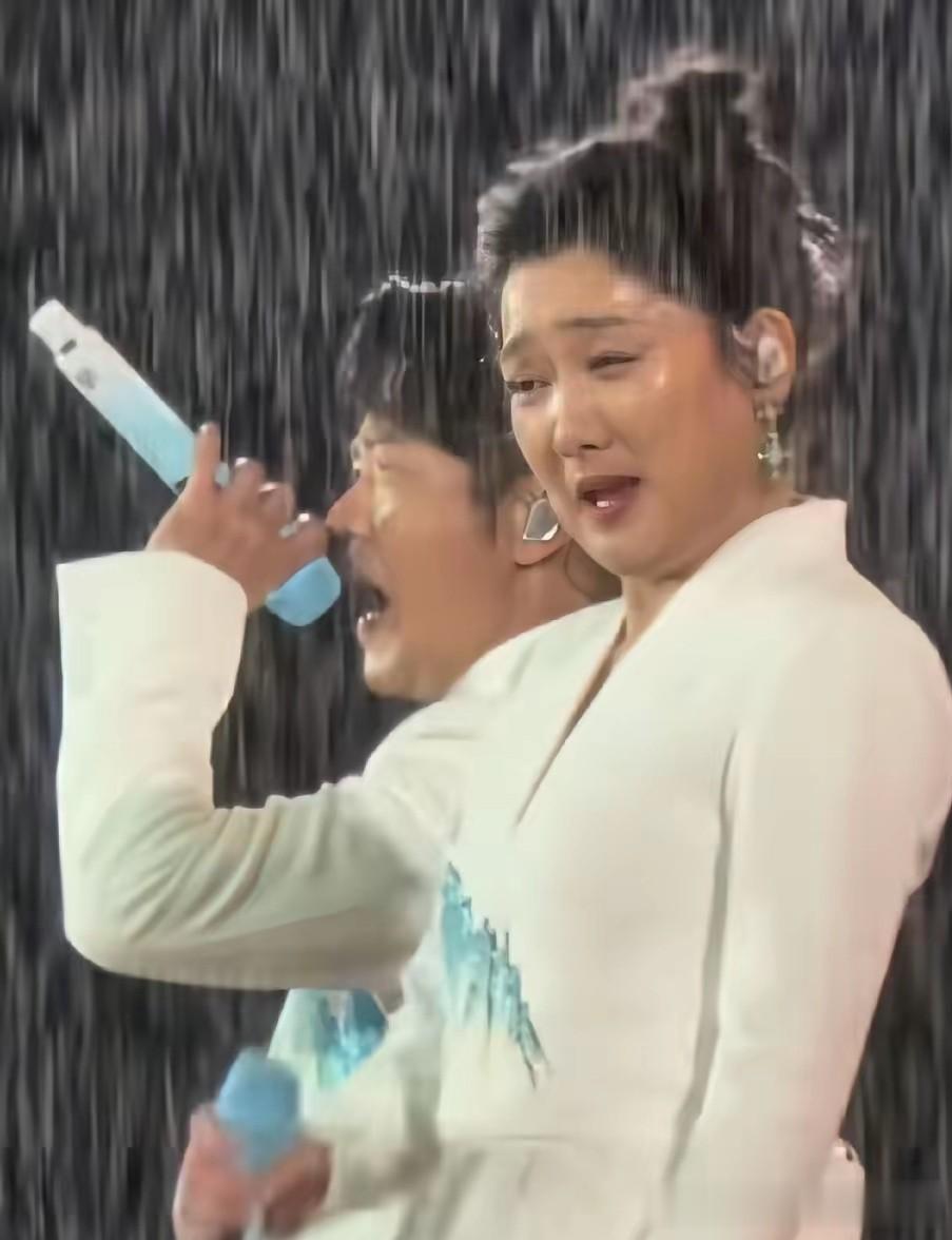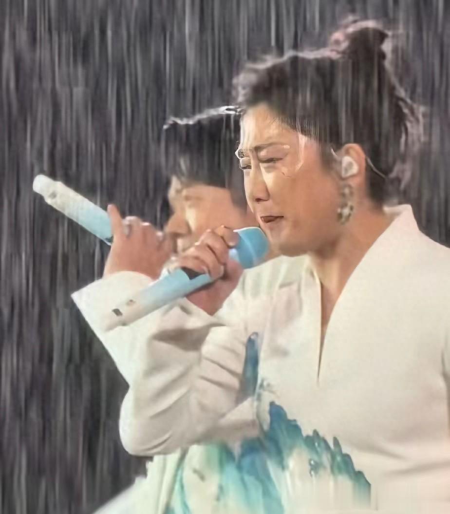 最让人佩服的,是玲花。雨水模糊了视线,甚至冲花了妆容,她的眼睛被大雨逼得几乎无法睁开,演唱难度系数直线飙升。但即便如此,当《山河图》那标志性的激昂前奏在雨幕中响起时,玲花的声线依然稳如磐石。那穿透雨水的高亢声浪,没有一丝颤抖,反而带着一种与天地共鸣的磅礴气势。大雨仿佛为这首描绘华夏壮丽的歌曲注入了特殊的灵魂,让《山河图》的气场比以往更加雄浑、更加震撼。
