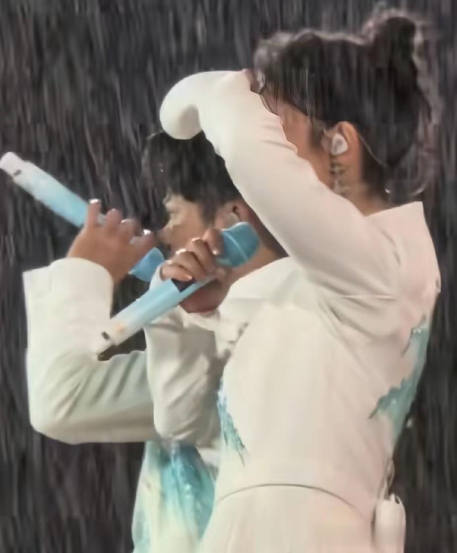 起初,舞台上还不乏伞具遮风挡雨。但短短几分钟后,一个令人动容的画面出现了:玲花和曾毅双双弃伞,将自己完全暴露在滂沱暴雨之中。观众尚有雨衣可抵御湿寒,而露天舞台上的两位歌手,却要直面雨水的冲刷与睁眼的困难。这一刻,他们与台下的数万观众融为一体,风雨同舟,不问前程。
