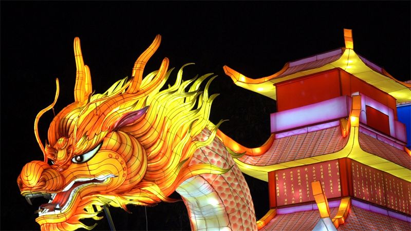 据介绍,本次灯展规模宏大,共设置近百组大小灯组,配置了95万只灯珠。其中,“飞龙抱柱”“龙船”“孙悟空”“敖丙”等大型灯组气势恢宏,深受游客欢迎。灯展不仅融合了传统非遗技艺,还引入了充满科技感的互动光影装置,让游客在赏灯之余,能够深切感受传统文化的独特魅力与现代科技的奇妙交融。