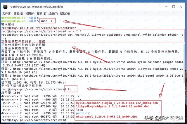 pdsyw@pdsyw-pc:~/桌面$ sudo -iroot@pdsyw-pc:~# cd /var/cache/apt/archives/root@pdsyw-pc:/var/cache/apt/archives# rm -rf *root@pdsyw-pc:/var/cache/apt/archives# apt reinstall libkysdk-qtwidgets ukui-panel kylin-calendar-plugin -d -yroot@pdsyw-pc:/var/cache/apt/archives# ll-rw-r--r-- 1 root root 526778 3月 20 13:58 kylin-calendar-plugin_3.25.0.0-0k3.122_amd64.deb-rw-r--r-- 1 root root 473106 3月 20 13:57 libkysdk-qtwidgets_2.5.1.0-0k0.16_amd64.deb-rw-r--r-- 1 root root 692372 4月 3 17:36 ukui-panel_3.26.0.0-0k3.21_amd64.deb说明: