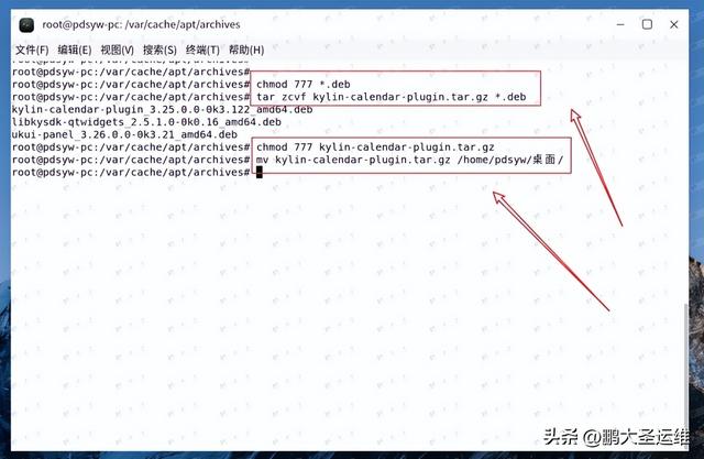 root@pdsyw-pc:/var/cache/apt/archives# chmod 777 *.debroot@pdsyw-pc:/var/cache/apt/archives# tar zcvf kylin-calendar-plugin.tar.gz *.debroot@pdsyw-pc:/var/cache/apt/archives# chmod 777 kylin-calendar-plugin.tar.gz root@pdsyw-pc:/var/cache/apt/archives# mv kylin-calendar-plugin.tar.gz /home/pdsyw/桌面/说明:将所需 .deb 安装包打成一个压缩包,并放到桌面,方便通过 U 盘或远程方式拷贝到目标机器(2403 系统)。