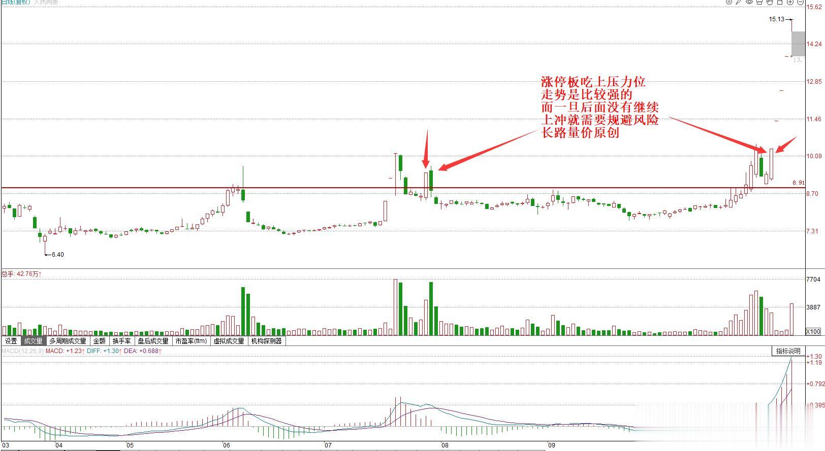 所以综合起来上面的条件之后,到了比较关键的地方,就是当股价走出来突破压力位的走势之后,还是以大阳线或者涨停板的姿势突破上来的,那么后面继续上涨的概率是极高的。