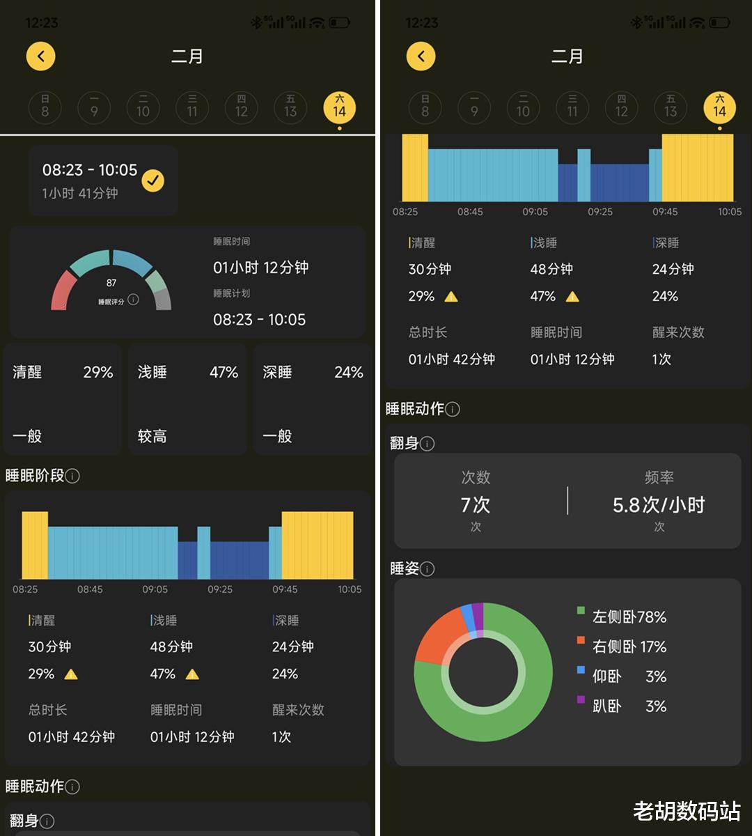 外出回来,想稍微睡会,直接佩戴试试,本以为睡眠监测报告起初被我视为锦上添花的功能。醒来打开APP,数据清晰地显示:睡眠时间为1小时12分钟,其中浅睡48分钟,深睡24分钟,醒来次数1次,翻身次数7次,这数据显示也太详细了吧,它没有用夸张的数字承诺什么奇迹,只是忠实地记录,然后让改善有迹可循。