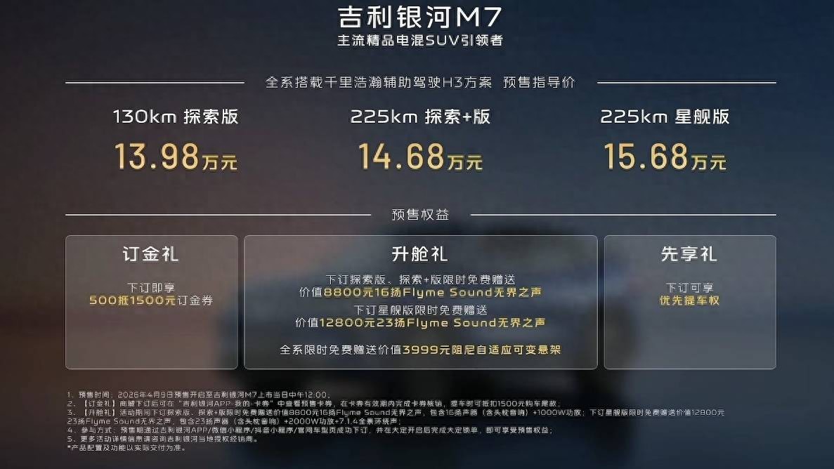 4月9日,吉利银河M7正式开启预售,共推出3款车型,预售价区间为13.98-15.68万元。新车定位紧凑型SUV,搭载神盾金砖电池,并全系搭载千里浩瀚辅助驾驶H3方案。