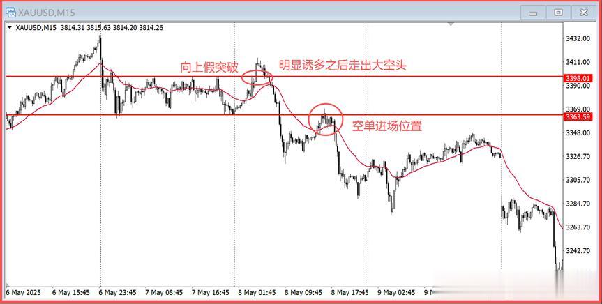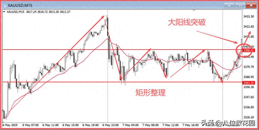 图中是黄金15分钟的K线图,左侧行情一波大幅上涨之后展开回落,并形成了矩形整理的结构。经过了一天的震荡整理,行情在3398的位置形成了大阳线的突破,一切看起来都是这么的完美,都符合多头的技术标准。