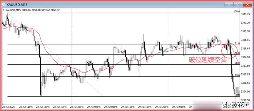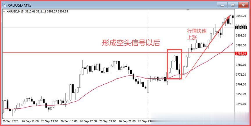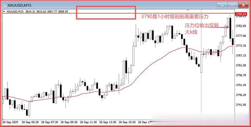 图中是黄金15分钟的K线图上方3790是一小时级别前高的重要压力,是历史的最高点。在这个压力位置行情前后两次承压震荡回落,尤其是第二次我在图中标注的大阳线之后的大阴线快速反包是标准的压力位加反转K线的形态,一切都是那么的完美,行情走空的概率非常大。