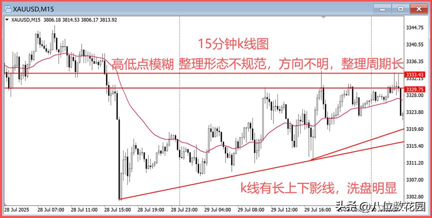 图中是黄金15分钟的K线行情,快速下跌了40多美金,随后展开了倾斜向上的整理。