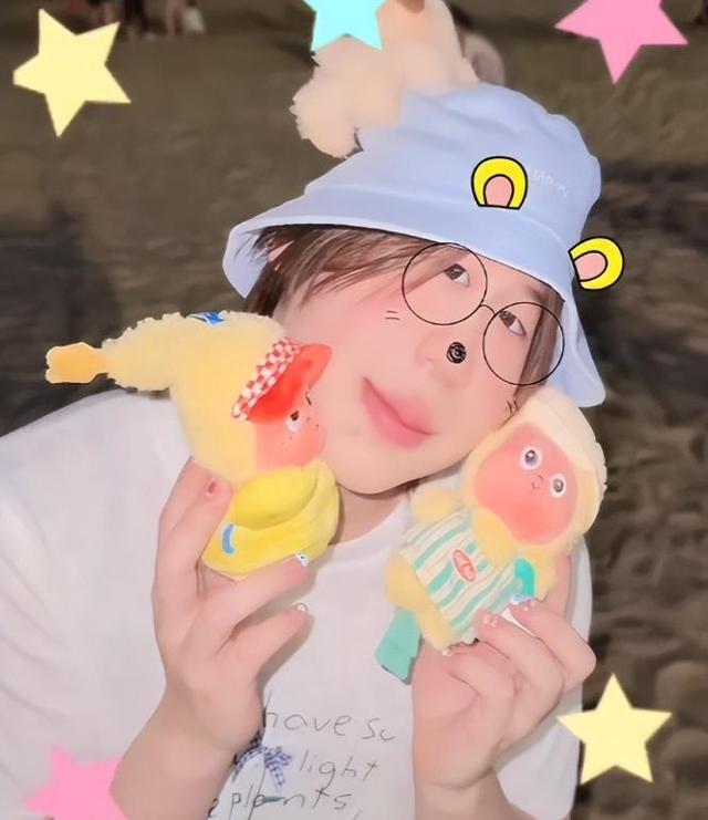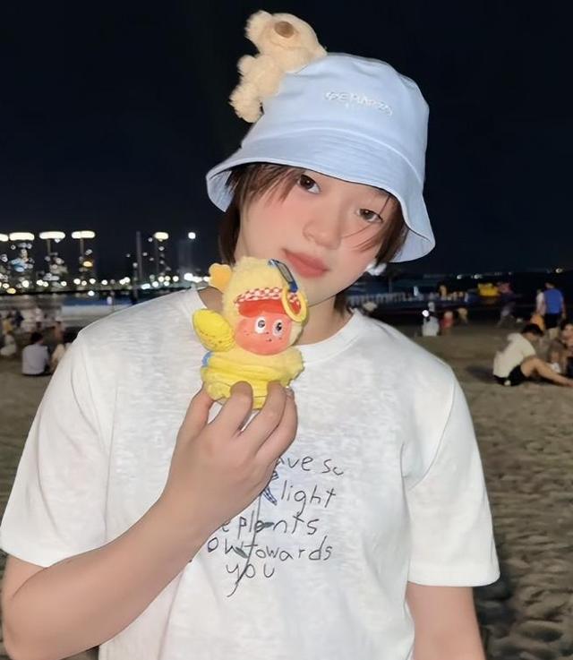 照片中的全红婵带着浅蓝色的渔夫帽,身穿一件非常简单的白短袖,非常减龄。