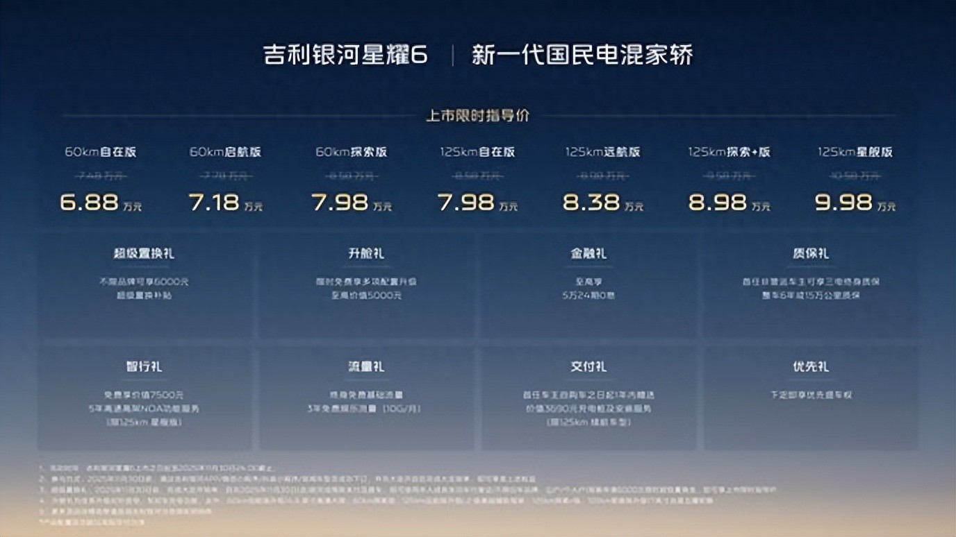 10月30日,新一代国民电混家轿吉利银河星耀6全球上市。新车共推出60km自在版、60km启航版、60km探索版、125km自在版、125km远航版、125km探索+版、125km星舰版7个版型,上市限时指导价为6.88万元-9.98万元。