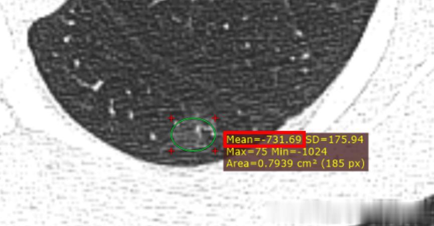 如下图就是一个左下肺磨玻璃结节的CT值测量,从这里我们可以看到,这个结节的CT平均值是-731.69HU。
