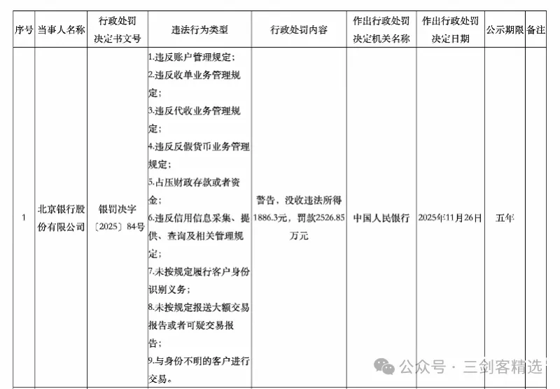 近年来,北京银行的合规问题犹如决堤之洪,一发不可收拾。2025年11月28日,中国人民银行的一纸罚单,将北京银行推上了风口浪尖——因九项严重违法行为,该行被警告并没收违法所得1886.3元,同时罚款高达2526.85万元。这一处罚力度之大,在城商行中极为罕见。更令人震惊的是,此次违规几乎覆盖了银行核心业务链条的每一个环节,从基础账户管理到支付结算,再到现金管理和核心风控领域,无一幸免。