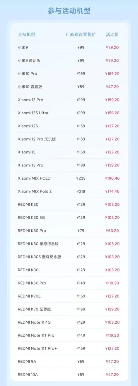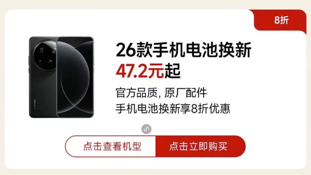 时间来到2026年3月,小米3月服务周开启,活动至3 月 7 日 24:00 结束。这次活动中支持 26 款手机电池换新,享8折优惠,换电池最低 47.2 元起。