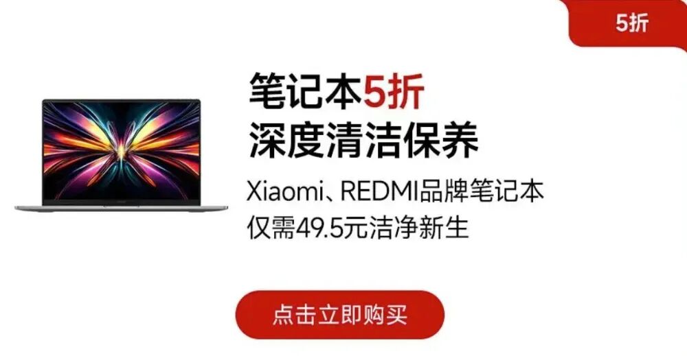 活动期间还有笔记本 5 折深度清洁保养,小米 、 REDMI 系列笔记本仅需 49.5 元。