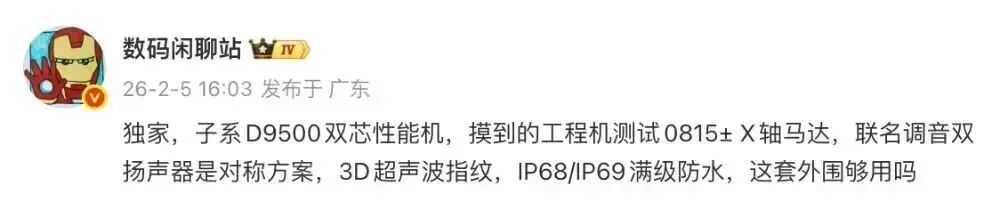 在此之前,博主@数码闲聊站 的一份爆料中也提到过,“子系D9500双芯性能机,摸到的工程机测试0815± X轴马达,联名调音双扬声器是对称方案,3D超声波指纹,IP68/IP69满级防水”等信息。