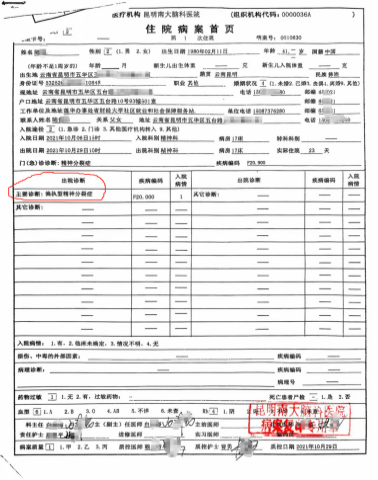 最致命的一击发生在国庆节。父亲以“头疼失眠”为由,执意前往昆明南大脑科医院就诊。当我陪同检查时,他竟然向医生谎称我患有精神病。医院不由分说将我捆绑,强制注射药物、服用精神类药品,并草率诊断为“偏执型精神分裂症”。入院记录上颠倒黑白。近一个月的非人道治疗中,我被剥夺人身自由,病历数据更被上传至系统,彻底坐实“精神病”的标签。
