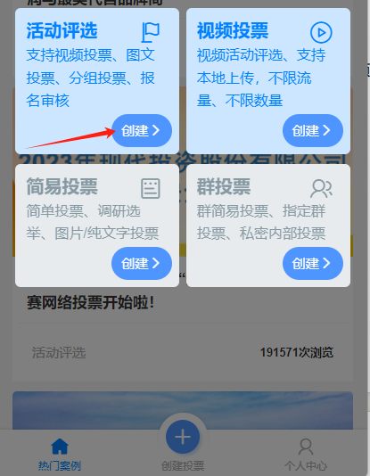 进入首页后,点击底部 【+ 创建投票】 按钮。选万能模版“活动评选”创建。