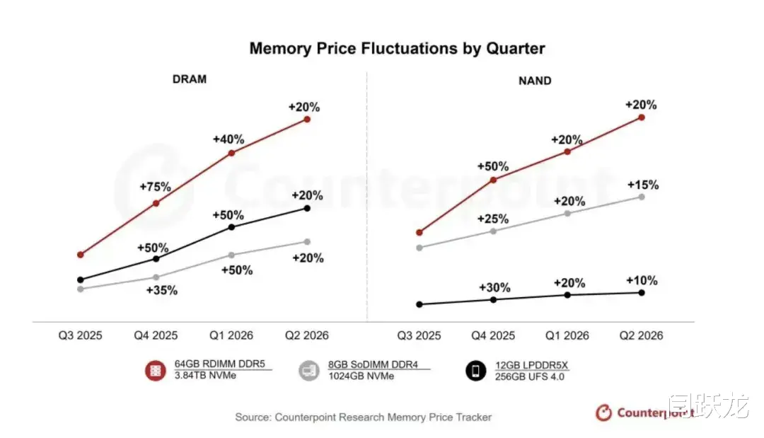 一方面,是存储芯片成本的大幅上涨。Counterpoint Research预计,2026年第一季度存储芯片价格将环比上涨40%至50%,第二季度还将再上涨约20%。机构预测,上游成本的上升,加上市场需求的萎靡,将让2026年手机市场出现下滑。IDC就警告,2026年中国智能手机市场出货量或将出现较明显回落。