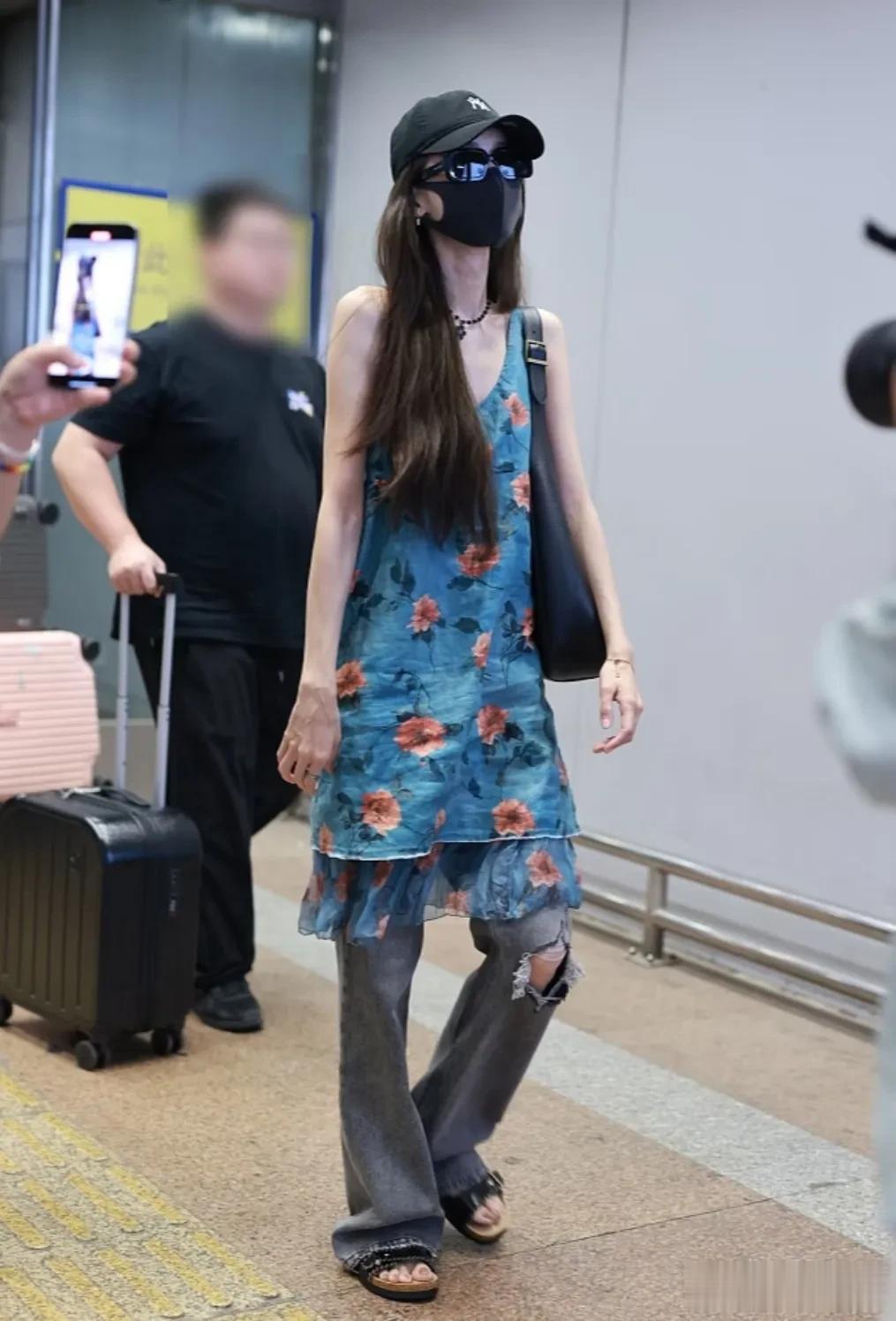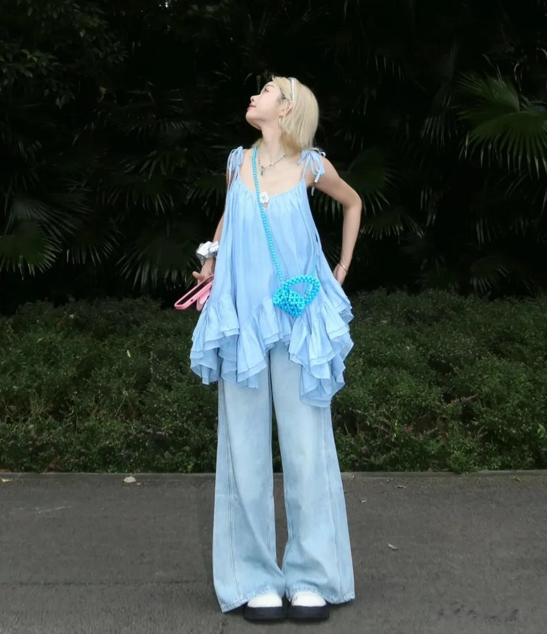 娜扎本人还有一条修身款的蓝色长裙搭配破洞裤,加凉鞋整个人也是潮女感拉满。