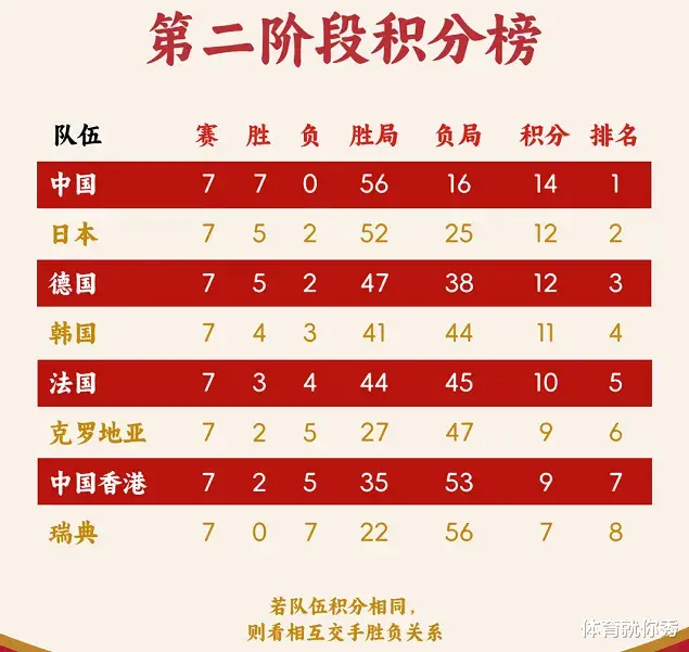2025年混合团体世界杯的比赛,也是进入到了最后阶段,昨天8支球队都是一日双赛,也是结束了第二阶段的所有比赛,中国队继续