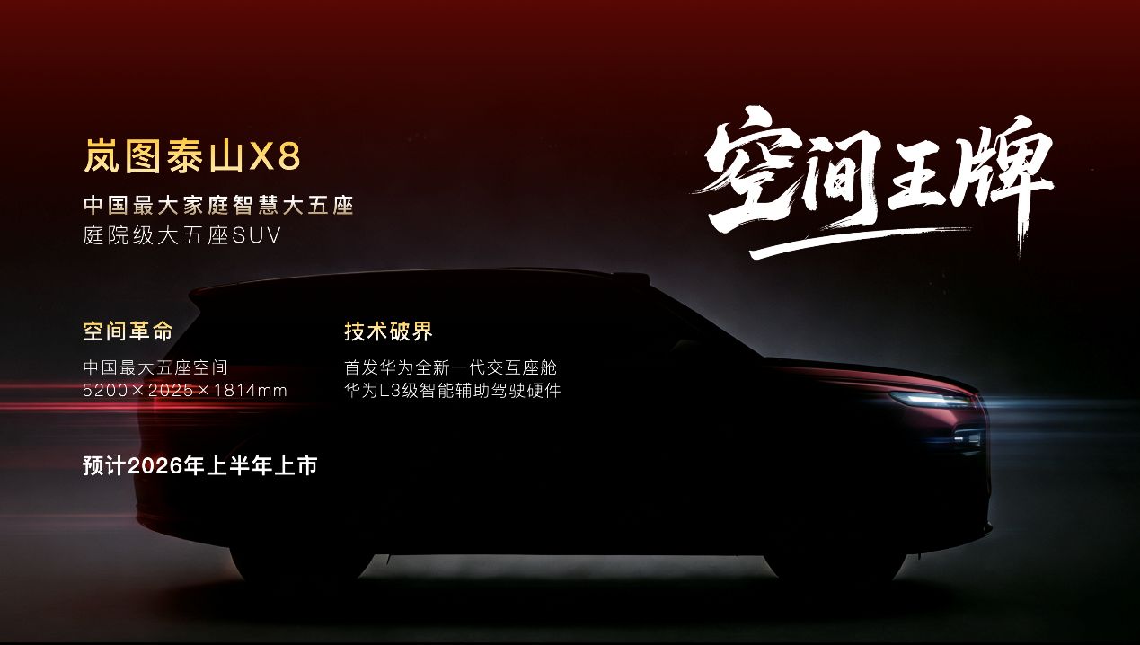 1月28日,岚图汽车重磅发布2026年产品计划,宣布将推出四款全新车型,包括中国首款量产L3级SUV岚图泰山Ultra、“庭院级大五座SUV”岚图泰山X8,代号为“FE”的全新FUV,以及代号为“珠峰”的“50万级行业最强”MPV。其中,岚图泰山X8将于2026年上半年上市。该车将搭载问界M9同款四激光雷达,首发华为全新一代交互座舱,同时还拥有独一无二的巨大空间,彰显了岚图汽车在智能化、高端化上的坚定决心。