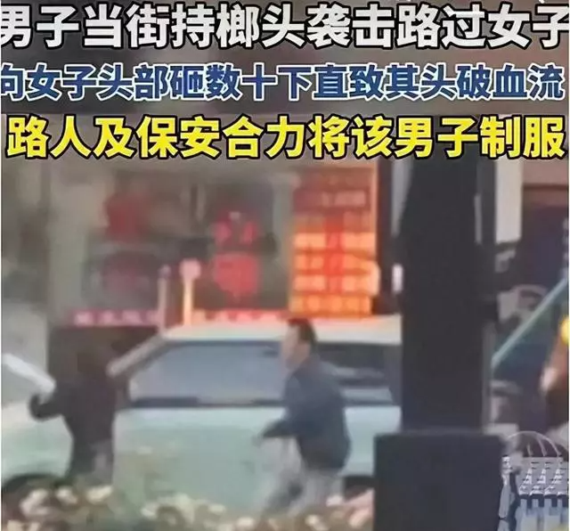 一名男子举着榔头紧随其后,并加速冲向她,可能是女子穿着高跟鞋的原因,不过几秒的功夫,男子便追上了她,随后用铁榔头狠狠地砸向女子的脑袋。