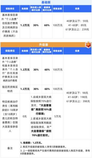 二共享:为了扩大大连普惠保受益人群将基本医保目录外“个人自费”住院医疗费用保障和基本医保目录内“个人自付”的住院医疗费用保障的免赔额合并为1.2万元。
