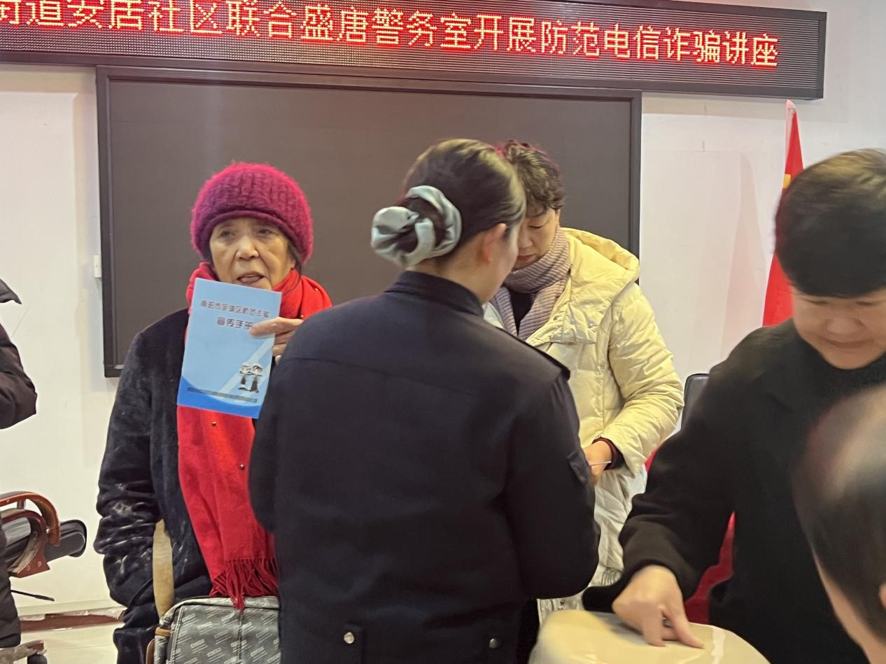 讲座现场,盛唐警务室民警结合日常办案中遇到的真实案例,用通俗易懂的语言拆解了网络贷款、刷单返利、冒充电商物流客服、虚假投资理财等高发诈骗类型的作案套路,重点提醒大家凡是遇到涉及转账汇款、索要银行卡号、密码和验证码的情况,一定要多留个心眼,多方核实确认,切勿轻信陌生来电和信息。社区工作人员则现场发放反诈宣传手册,手把手教居民辨别诈骗短信、链接的小技巧,还告知大家遭遇诈骗后要第一时间保存证据并拨打110报警,最大限度减少财产损失。