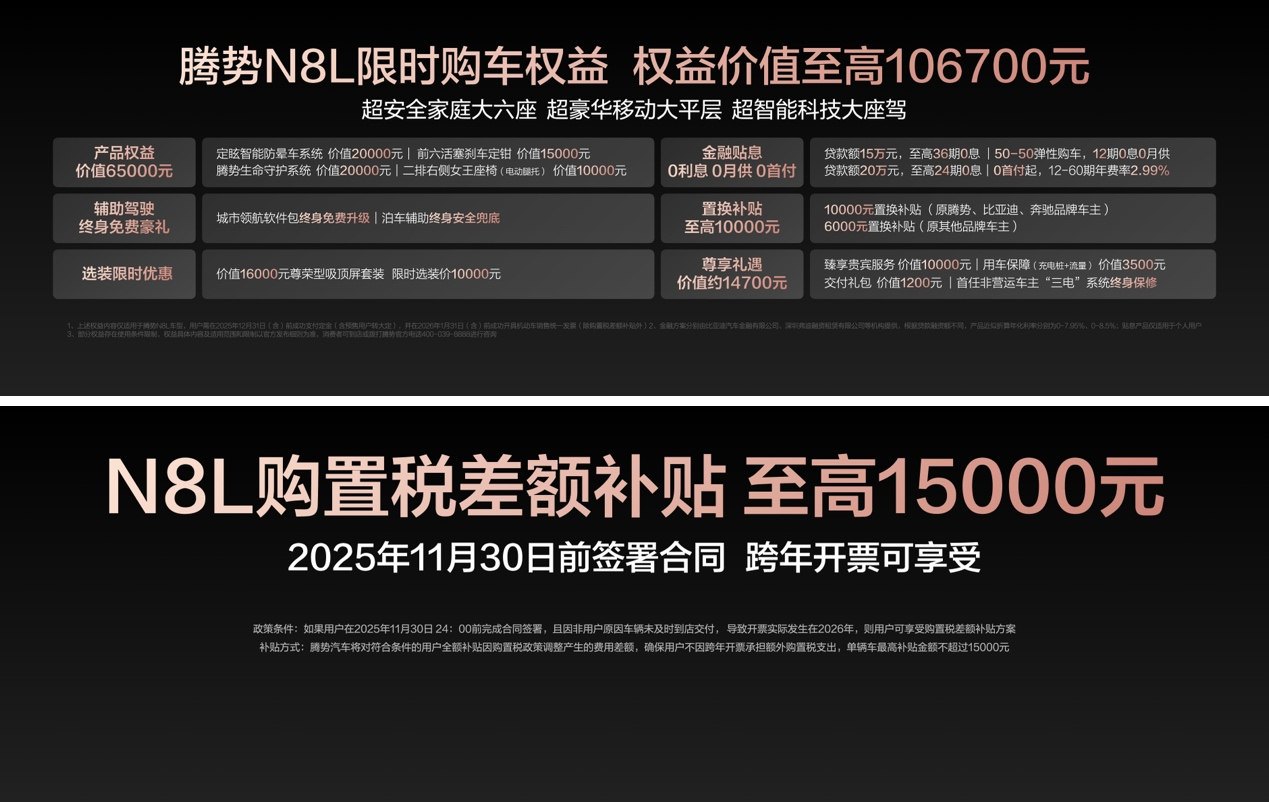 为回馈广大用户的支持与信赖,腾势N8L特别推出限时购车权益,权益价值至高10.67万元!包括价值1.7万元的三年免息,最高1万元的置换补贴。此外,不必担心因为交车晚,享受不到购置税补贴:在2025年11月30日24点前完成合同签署的用户,如果因非用户原因车辆未及时交付,导致开票实际发生在2026年,可享受购置税差额补贴,最高1.5万元!