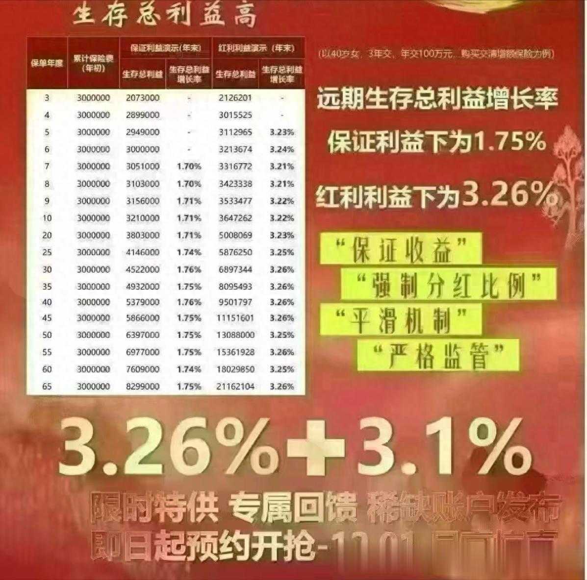 万能金当下执行3.1的利率,就算是单独只买万能金,如果万能金不再上升,那也只能无限趋近于3.1。而主险分红在监管的限制之下实际得到的总生存利益也是不能超过3.1,再加上前五年没有收益,在超长期跨度下趸交主险的总收益率能达到3.0就基本是极限了。那怎么可能会有3.26的总收益率?