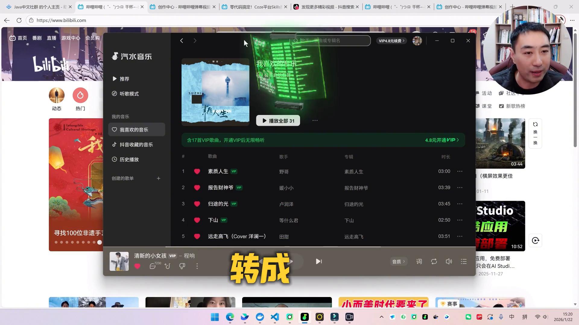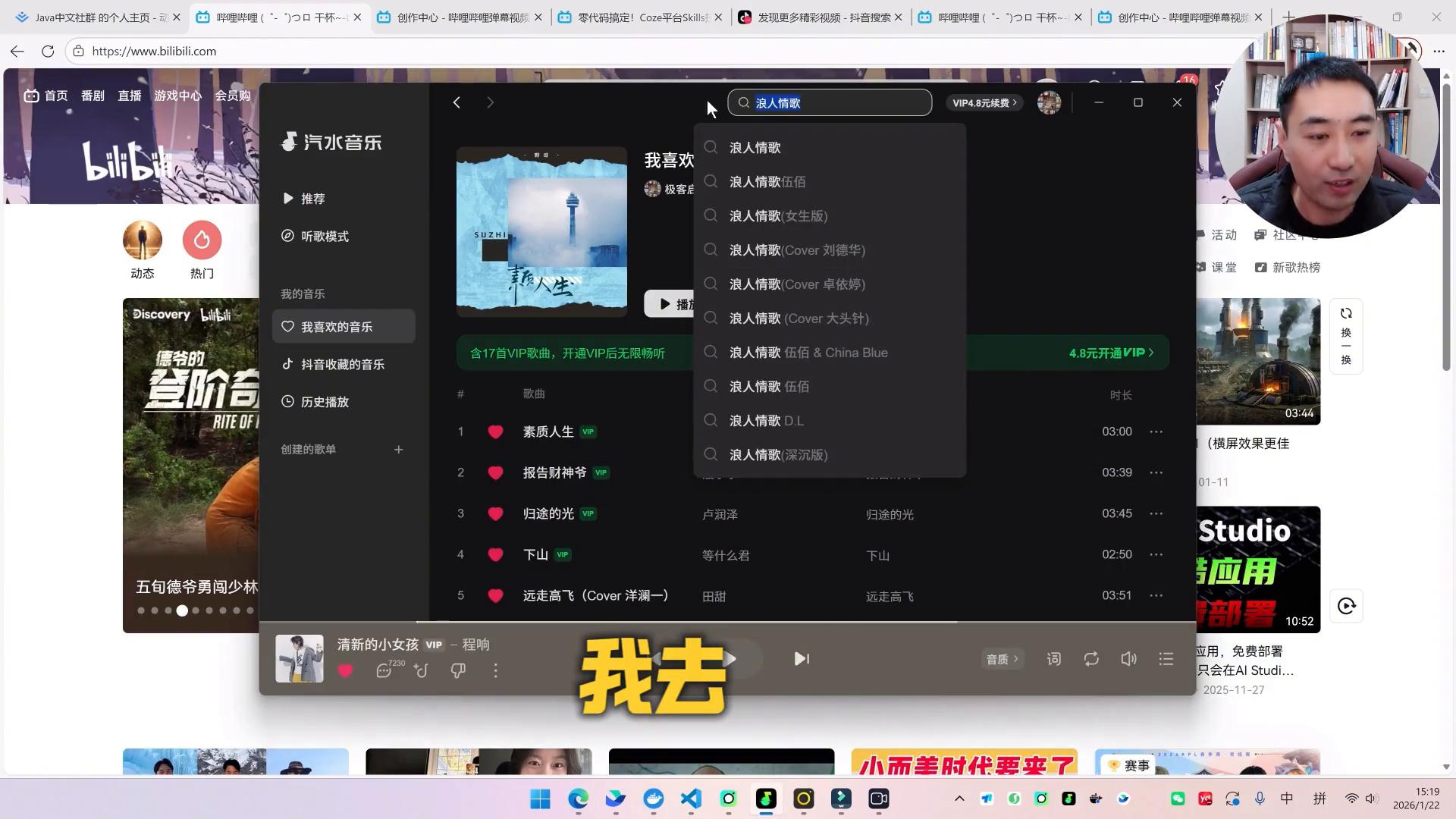 大家也可以看到,当要进行语音转文字的时候,底下就会出现一个绿色的小标,所说的所有的话都帮我能够转成文字。看到没,这是vs code,任何地方都可以。比如这时候要去搜索歌曲,这时候就打开歌曲,去搜索一个伤心太平洋。别打字,只需要动动嘴皮子就行了。