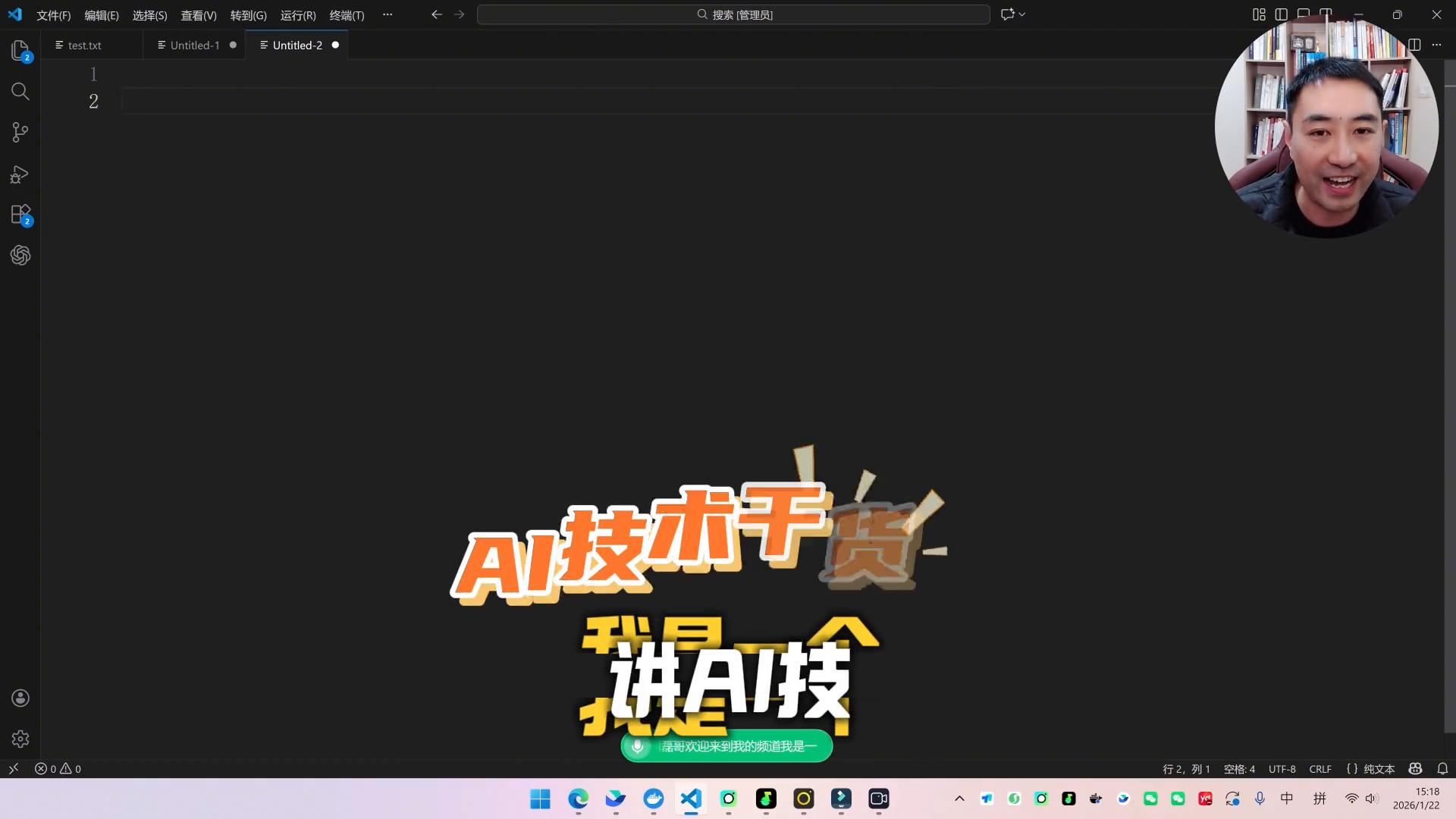 比如现在在vs code里面,随便去打开一个新的文本,这时候告诉他:大家好,我叫磊哥,欢迎来到我的频道,我是一个讲AI技术干货的博主。看到没,手只要一松就行了。