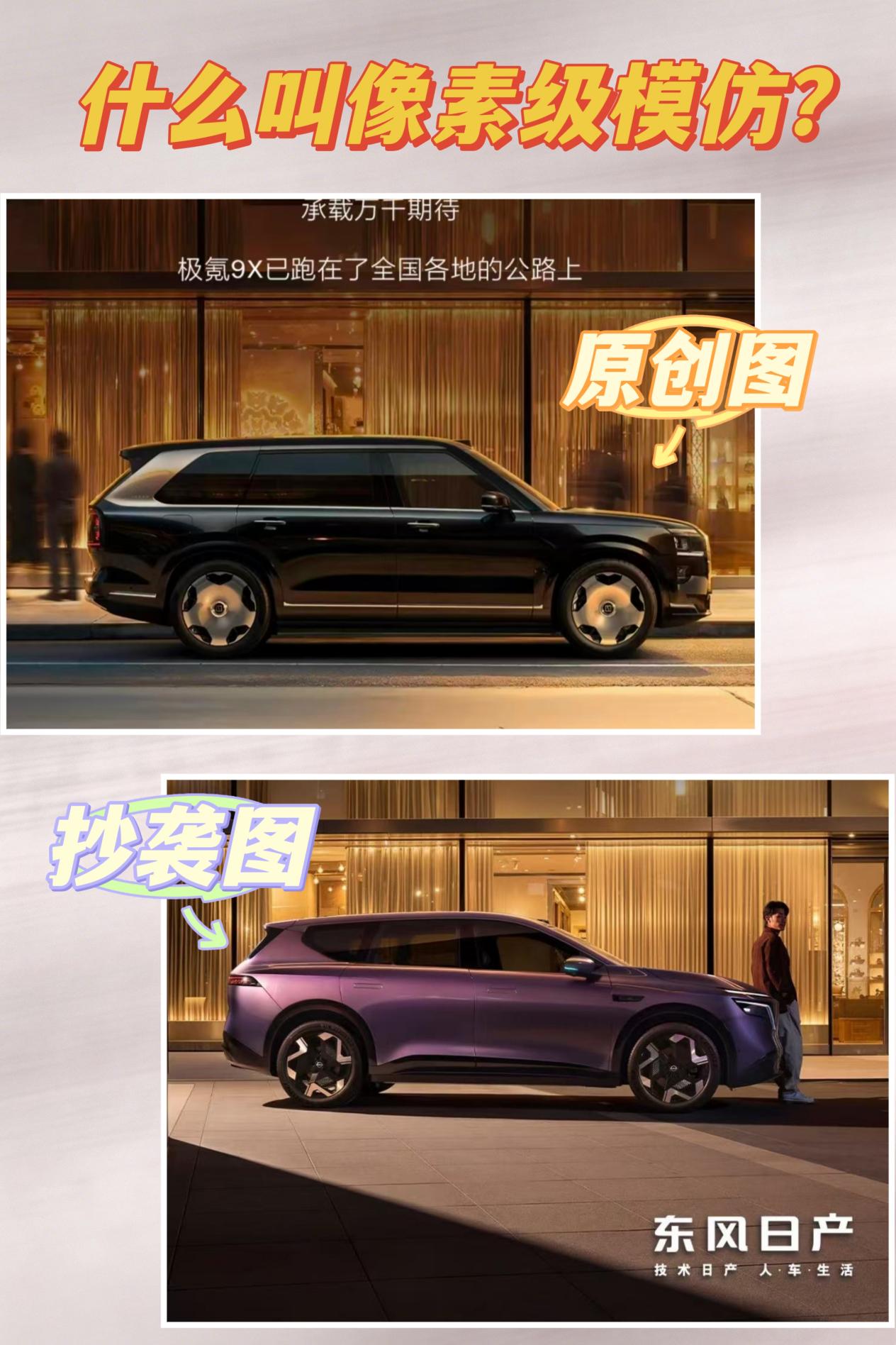 原创不行,但要说模仿,东风日产肯定第一!现NX8海报直接复刻极氪9X的画面设计,硬是一点儿不改...也难怪网友集体在东风日产官号下为极氪鸣不平