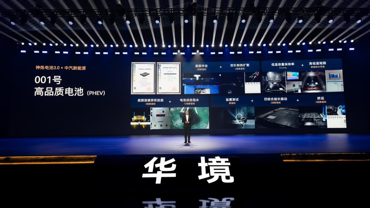 三电安全层面,华境S神炼电池3.0搭载宁德时代超级增·混电芯,打造独有的系统级五“零”安全,达成766亿公里零自燃的实战记录。该电池实现极限设计、极限制造、极限验证三大进化,PPB航空级制造标准,实现十亿分之一的严苛管控,为用户出行保驾护航。在极限验证中,神炼电池3.0不仅以裸电芯硬抗1500J(10倍新国标能量)底部撞击,仍能做到不起火、不爆炸,并通过贴近用户使用场景、超越新国标的四大串行测试,获中汽新能源001号(PHEV)高品质电池验证证书。新国标的四大串行测试,获中汽新能源001号(PHEV)高品质电池验证证书。