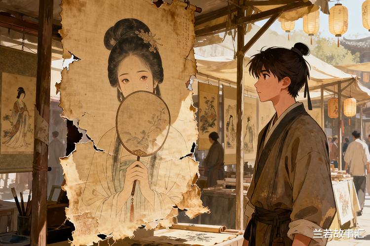 长安有位年轻画师叫吴云山。一日,他到古画市集闲逛,被角落里一幅残破的美人图吸引。画已十分古旧,绢本发黄,画轴上多有虫蛀,唯独画中女子的眉眼依旧清晰——她执团扇半掩面,只露出一双似泣非泣的明眸。那眼神凄婉哀怨,仿佛藏着一个说不尽的故事。"老板,这画我要了。"吴云山毫不犹豫地付款。