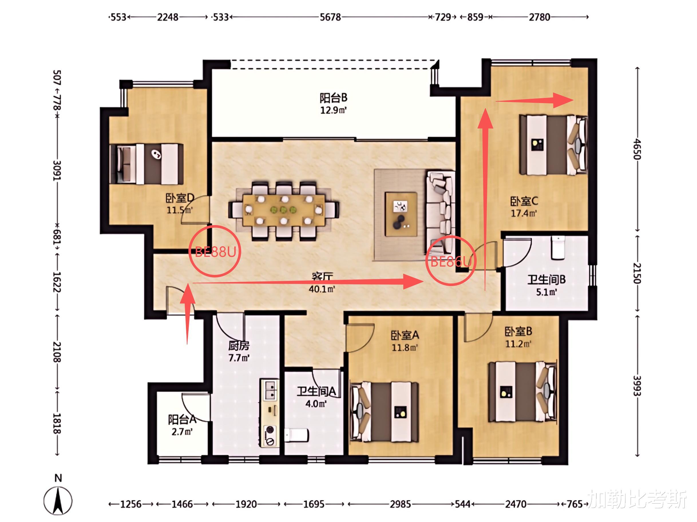 场景: 142平大平层,入户门旁边的玄关,是网络总入口,沙发背后再放了一台华硕RT-BE86U。