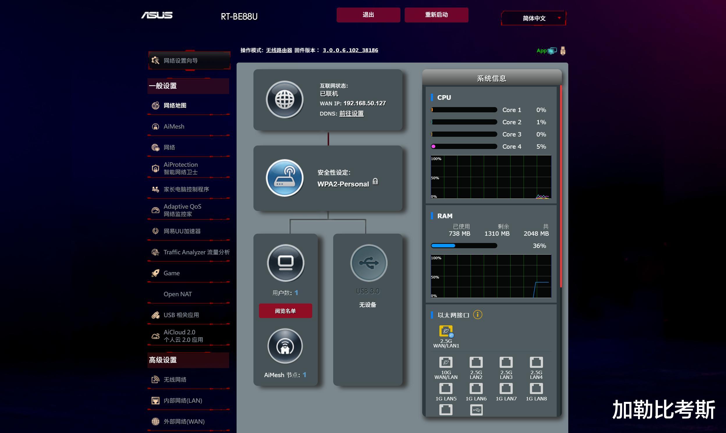 但是副路由咱们也可以考虑便宜些的,毕竟副路由只需要发射网络即可,AiProtection 网络神盾、场景智能加速、DHCP服务器等等反正是在主路由完成,消费的是主路由的算力。