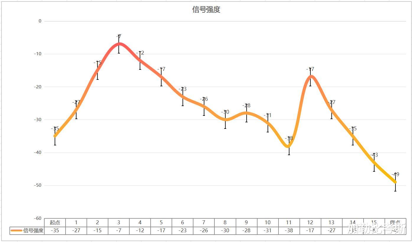 可以看到在起点位置信号强度极高,因为靠近华硕RT-BE88U,终点位置的信号强度最低,因为有墙的阻挡,信号强度为-49dBm左右,但是这个数据已经非常优秀,属于强信号范围之内。在咱们的日常使用中,这通常代表设备处于信号覆盖极佳的位置,能提供稳定流畅的网络体验。