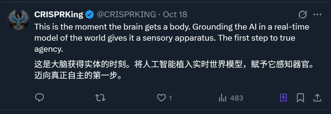 将AI植入实时世界模型,赋予其感知器官,这是迈向真正自主的第一步。