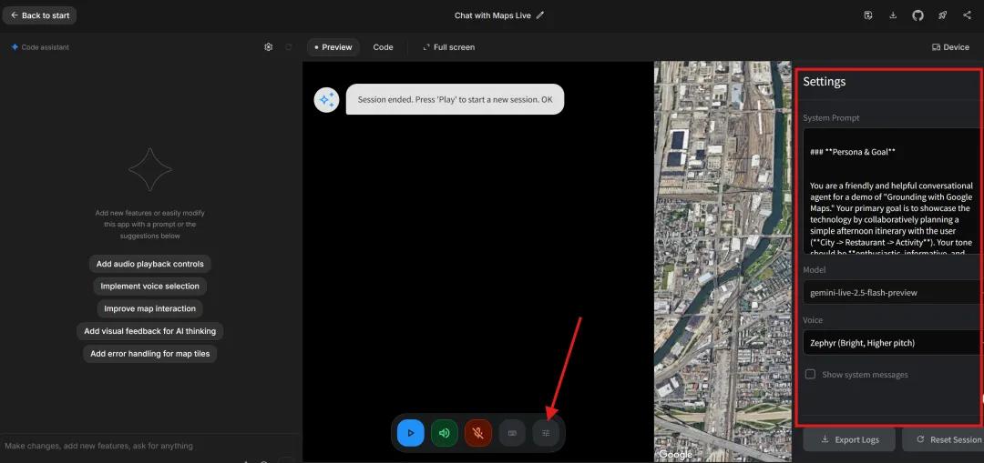 目前,所有人都能去谷歌AI Studio体验这项新功能。而且打开设置面板,我们还能根据自己的需要切换不同的模型和语音,甚至右侧还能看到系统提示词。