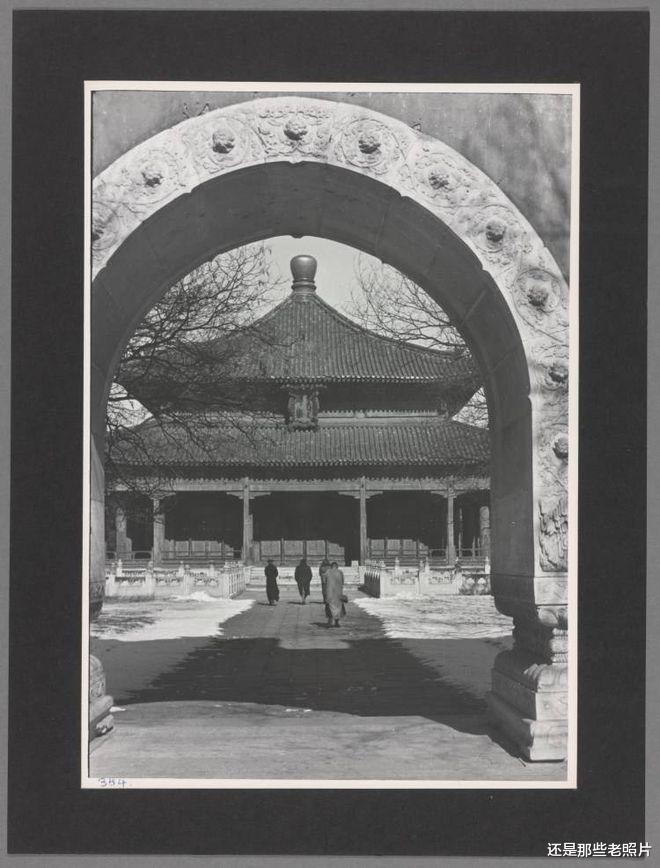这组黑白老照片拍摄于民国时期(约 1930-1940 年代),由供职于欧亚航空公司的德国飞行员 J.P. Koster 所拍摄。画面中央是辟雍殿,重檐歇山顶覆以琉璃瓦,殿身四周环水,汉白玉栏杆与石桥清晰可见,是清代皇帝讲学的场所,象征 “辟雍泮水” 的古制。
