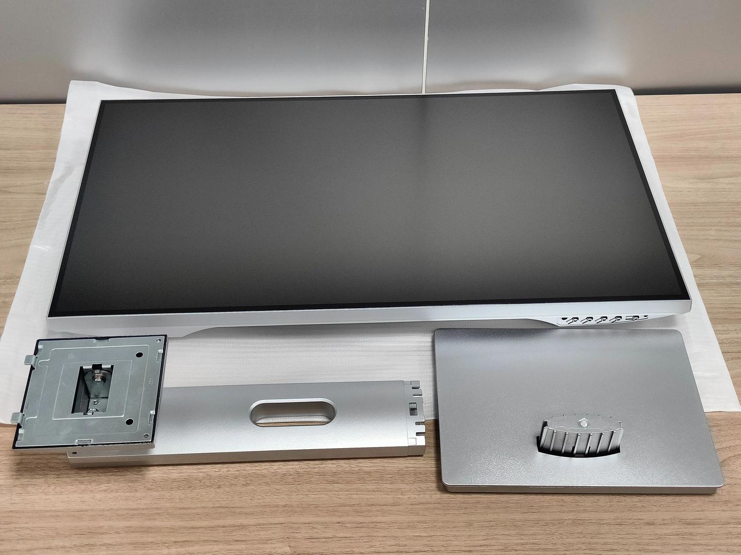 开箱、检查配件,厂家给得特别实在:显示器主体、一个方形底座、一根 DP 线 ,还有电源和说明书,无需额外购买,即可享受显示器的高刷体验。