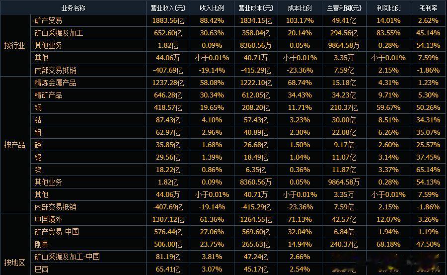 公司是全球前七大钼生产商,虽然名字里叫钼业,真正赚钱靠的是铜,公司坐拥KFM、TFM两座世界级铜矿,利润比例接近60%。钼的利润比例只有6%,而精矿和钴产品的利润都要比钼高,但比例都低于10%。