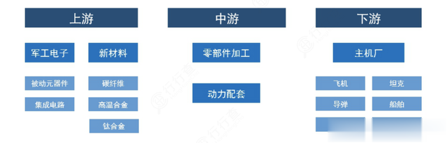 军工产业链零部件企业、中游的零部件加工企业和下游的主机厂,上游的零部件企业主要包括军工新材料以及军工电子,中游的零部件加工企业主要包括航空、战车、舰艇、核动力产品用发动机、雷达、火力控制等,下游的主机厂主要是负责军工产品设计和总装的企业。