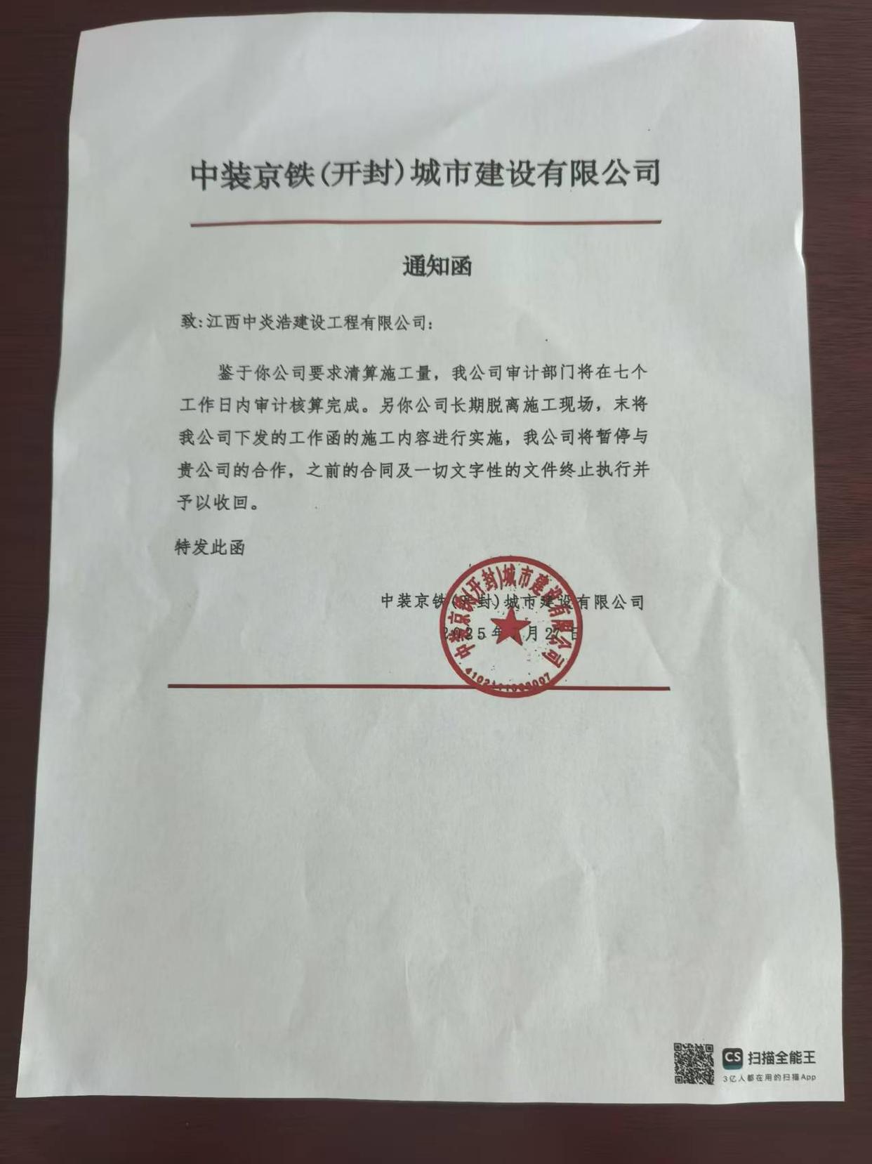 2025年3月10日,江西中炎浩建设工程有限公司和中装京铁(开封)城市建设有限公司签订了开封六大街豪门国际工地施工合同,于2025年3月11日拿到了进场通知书,本以为项目可以顺利推进达到共赢,未曾想这是对施工方早已挖好的陷阱。