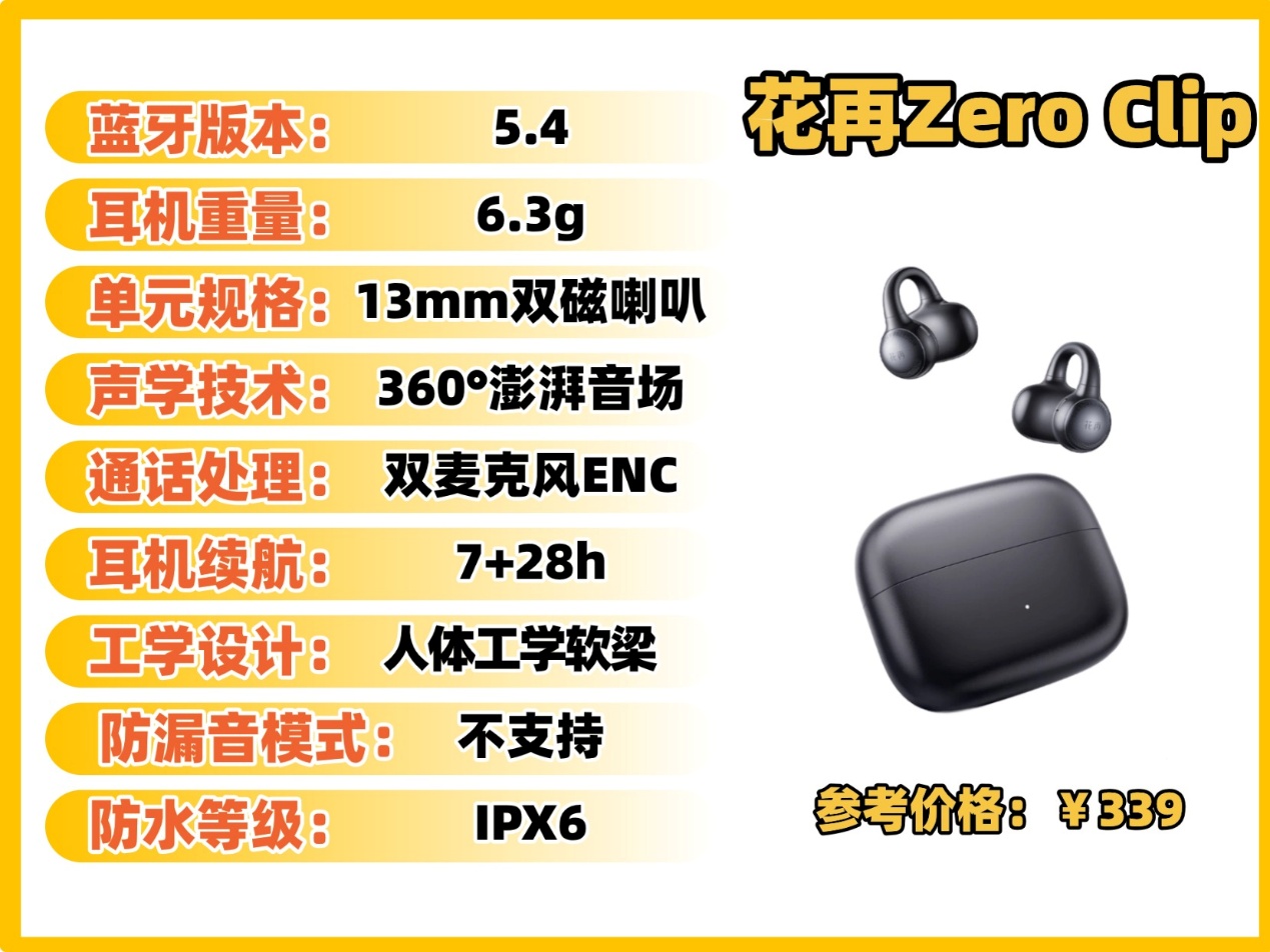 这款耳机采用的是新形态耳夹式设计,外壳是透明的,还可以看到里面的零器件,单只耳朵的重量不算高,5.7g,但耳机选用的材质很硬,弹性和延展性表现较差,我戴上去就受不了了,耳朵很痛,音质方面,耳机内置了一颗17mm的大尺寸动圈单元,低频方面下潜很深,弹性很足,中频方面人声表现清晰,但声场层次感一般,只适合对音质要求不高、以通勤或运动为主的人。硬件配置上使用的是蓝牙5.3芯片,连接速度和稳定性比较稳定,续航保持,有40个小时,有需要的可以试试