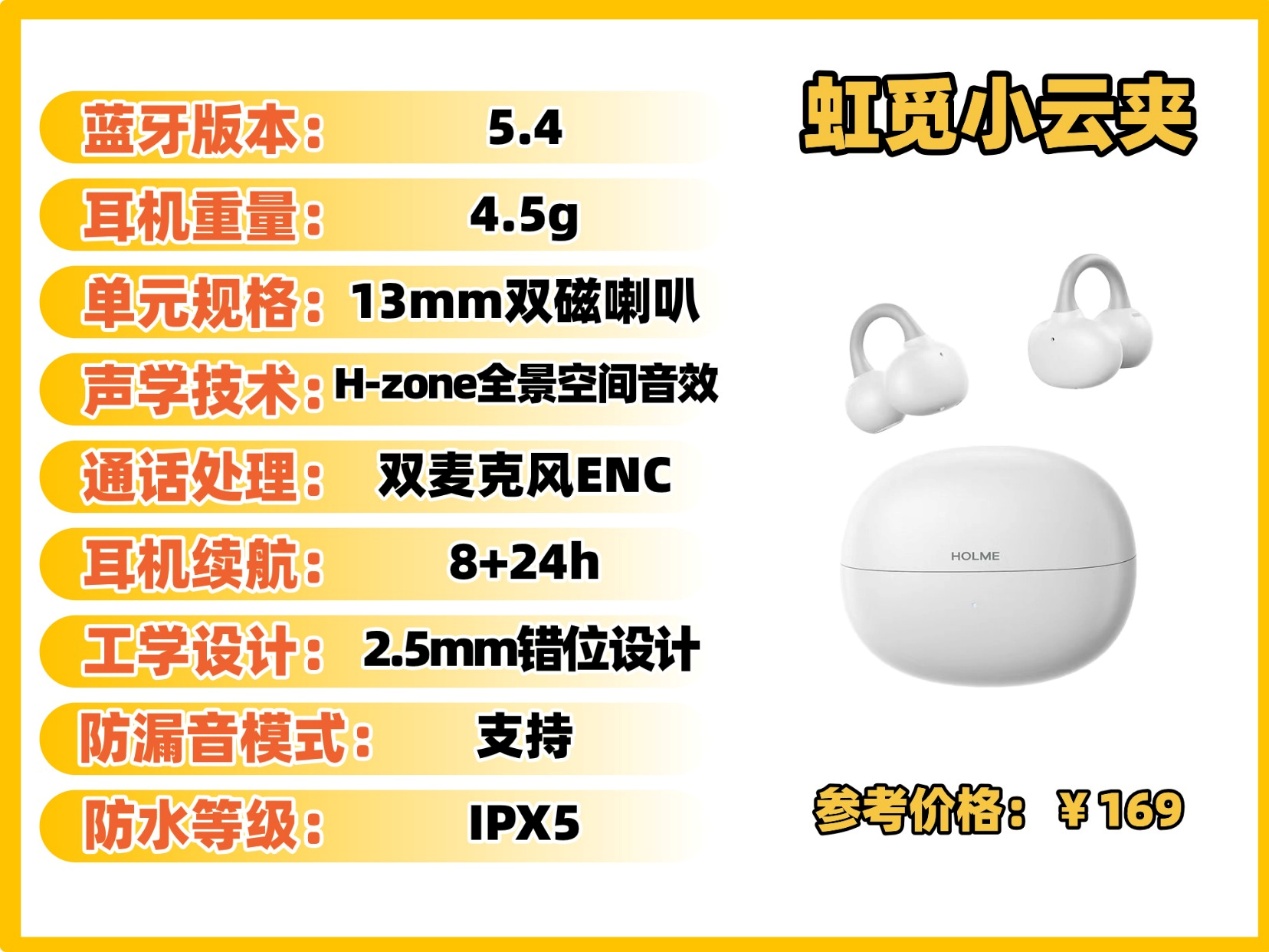 虹觅HOLME Clip Pro的整个佩戴体验还是挺舒服的,耳机采用了2.5mm的错位设计,采用前高后低的状态让耳机夹在耳朵上,更契合耳部轮廓,能更稳定的与耳朵贴合在一起,电池部分则是采用了∠12的弧面耳托设计,与耳朵贴合的很自然,稳定性也不错,音质上,Clip Pro表现很不错,主要是其采用的是13mm双磁喇叭和石墨烯科技振膜,两块高精度的磁铁,相互叠加在一起,加强了磁场,从而提高音质、音量,此外,耳机还采用了气旋式引擎腔体技术,打造成了圆柱形铝合金金属腔体,这种结构可以承载更多的气流量,声音的推力也更强,音质还不易失真,再加上虹觅声学实验室的精准调音,音质表现十分出色,和500价位的耳机音质相当;性能表现也不错,首先它支持虹觅自研的防漏音模式,开启后可以很明显的感受到漏音减少了,耳机还支持目前最新的蓝牙6.0芯片,通话效果上,一副耳机配备有四颗麦克风,通话效果很不错,非常畅快,然后它还支持双设备连接和60ms的低延迟,
